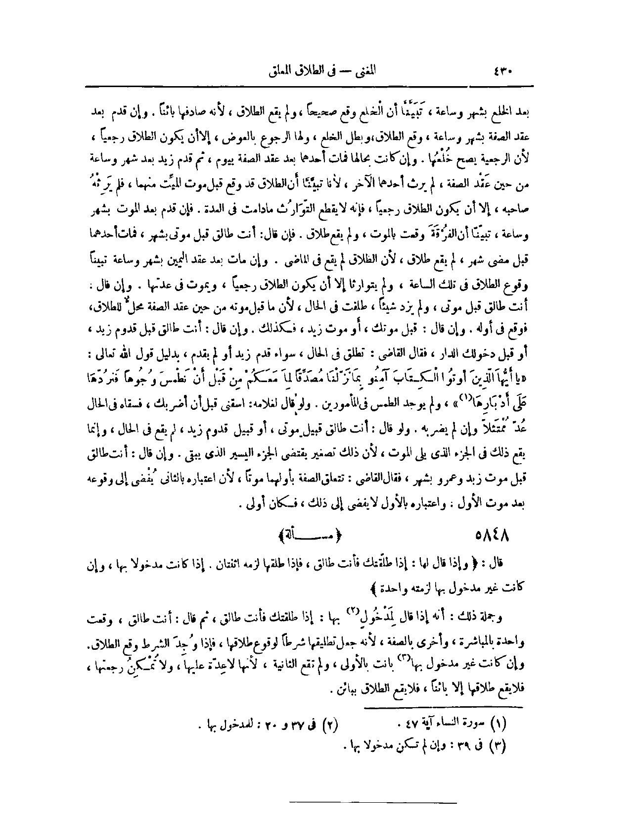 وَإِنْ قَالَ: أَنْتِ طَالِقٌ قَبْلَ قُدُومِ زَيْدٍ، أَوْ قَبْلَ دُخُولِكِ الدَّارَ. فَقَالَ الْقَاضِي: تَطْلُقُ فِي الْحَالِ، سَوَاءٌ قَدِمَ زَيْدٌ أَوْ لَمْ يَقْدَمْ؛ بِدَلِيلِ قَوْلِ اللَّهِ تَعَالَى: {يَا أَيُّهَا الَّذِينَ أُوتُوا الْكِتَابَ آمِنُوا بِمَا نَزَّلْنَا مُصَدِّقًا لِمَا مَعَكُمْ مِنْ قَبْلِ أَنْ نَطْمِسَ وُجُوهًا فَنَرُدَّهَا عَلَى أَدْبَارِهَا} [النساء: ٤٧] وَلَمْ يُوجَدْ الطَّمْسُ فِي الْمَأْمُورِينَ. وَلَوْ قَالَ لِغُلَامِهِ: اسْقِنِي قَبْلَ أَنْ أَضْرِبَكَ. فَسَقَاهُ فِي الْحَالِ، عُدَّ مُمْتَثِلًا وَإِنْ لَمْ يَضْرِبْهُ. وَلَوْ قَالَ: أَنْتِ طَالِقٌ قُبَيْلَ مَوْتِي، أَوْ قُبَيْلَ قُدُومِ زَيْدٍ. لَمْ يَقَعْ فِي الْحَالِ، وَإِنَّمَا يَقَعُ ذَلِكَ فِي الْجُزْءِ الَّذِي يَلِي الْمَوْتَ؛ لِأَنَّ ذَلِكَ تَصْغِيرٌ يَقْتَضِي الْجُزْءَ الْيَسِيرَ الَّذِي يَبْقَى.