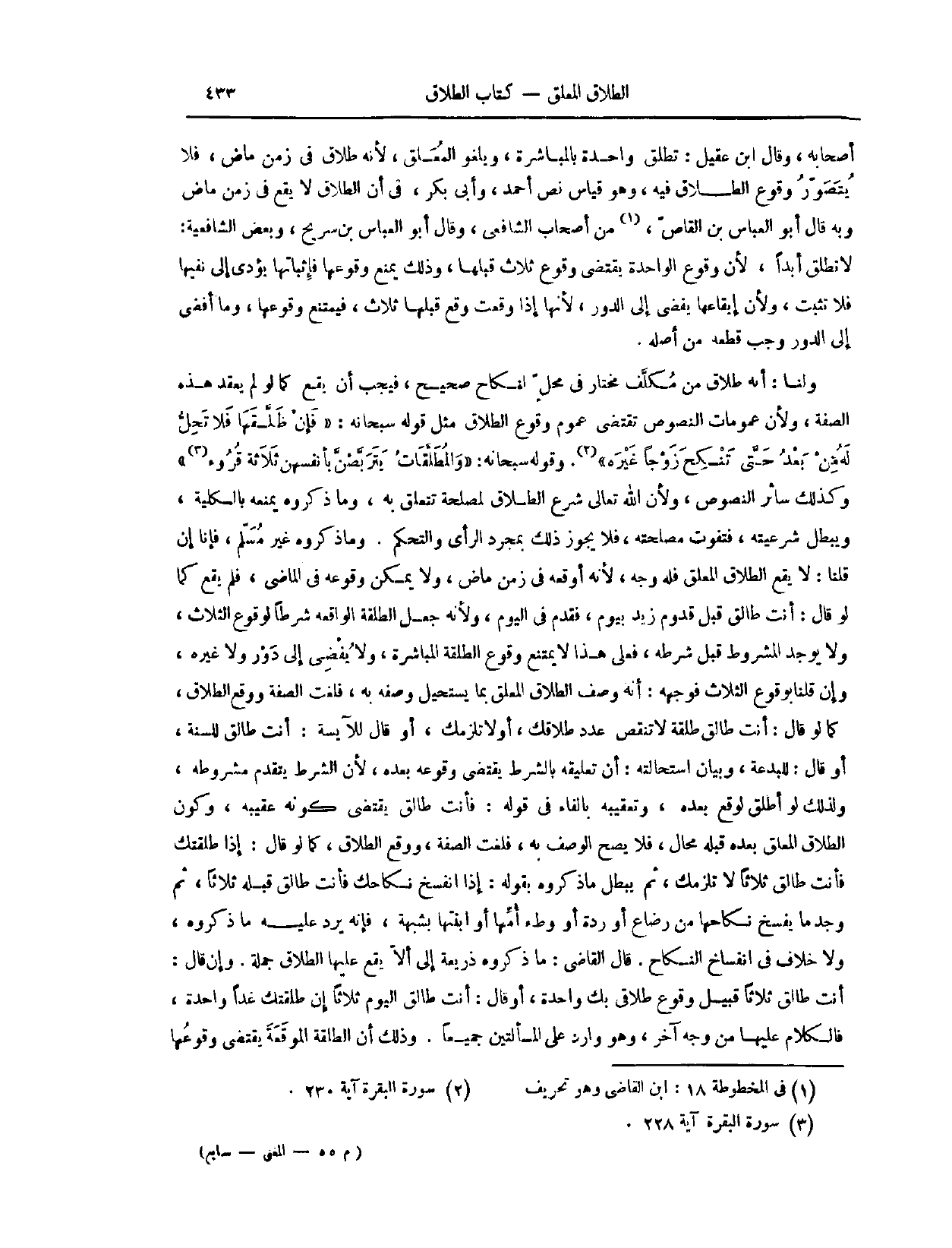 وَكَذَلِكَ سَائِرُ النُّصُوصِ، وَلِأَنَّ اللَّهَ تَعَالَى شَرَعَ الطَّلَاقَ لِمَصْلَحَةٍ تَتَعَلَّقُ بِهِ، وَمَا ذَكَرُوهُ يَمْنَعُهُ بِالْكُلِّيَّةِ، وَيُبْطِلُ شَرْعِيَّتَهُ، فَتَفُوتُ مَصْلَحَتُهُ، فَلَا يَجُوزُ ذَلِكَ بِمُجَرَّدِ الرَّأْيِ وَالتَّحَكُّمِ، وَمَا ذَكَرُوهُ غَيْرُ مُسَلَّمٍ؛ فَإِنَّا إنْ قُلْنَا: لَا يَقَعُ الطَّلَاقُ الْمُعَلَّقُ، فَلَهُ وَجْهٌ؛ لِأَنَّهُ أَوْقَعَهُ فِي زَمَنٍ مَاضٍ، وَلَا يُمْكِنُ وُقُوعُهُ فِي الْمَاضِي، فَلَمْ يَقَعْ، كَمَا لَوْ قَالَ: أَنْتِ طَالِقٌ قَبْلَ قُدُومِ زَيْدٍ بِيَوْمٍ. فَقَدِمَ فِي الْيَوْمِ، وَلِأَنَّهُ جَعَلَ الطَّلْقَةَ الْوَاقِعَةَ شَرْطًا لِوُقُوعِ الثَّلَاثِ، وَلَا يُوجَدُ الْمَشْرُوطُ قَبْلَ شَرْطِهِ، فَعَلَى هَذَا لَا يَمْتَنِعُ وُقُوعُ الطَّلْقَةِ الْمُبَاشَرَةِ، وَلَا يُفْضِي إلَى دَوْرٍ وَلَا غَيْرِهِ. وَإِنْ قُلْنَا بِوُقُوعِ الثَّلَاثِ، فَوَجْهُهُ أَنَّهُ وَصَفَ الطَّلَاقَ الْمُعَلَّقَ بِمَا يَسْتَحِيلُ وَصْفُهُ بِهِ، فَلَغَتْ الصِّفَةُ، وَوَقَعَ الطَّلَاقُ، كَمَا لَوْ قَالَ: أَنْتِ طَالِقٌ طَلْقَةً لَا تُنْقِصُ عَدَدَ طَلَاقِك، أَوْ لَا تَلْزَمُك. أَوْ قَالَ لِلْآيِسَةِ: أَنْتِ طَالِقٌ لِلسُّنَّةِ. أَوْ قَالَ: لِلْبِدْعَةِ.