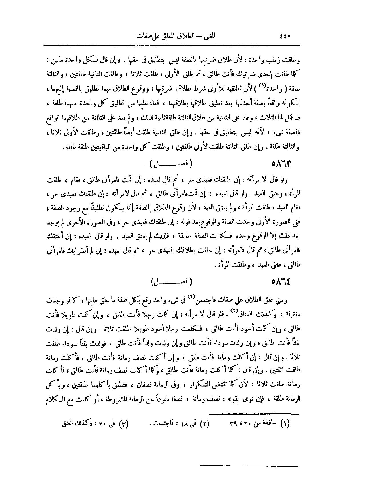 (٥٩٤٢) فَصْلٌ: وَمَتَى عَلَّقَ الطَّلَاقَ عَلَى صِفَاتٍ، فَاجْتَمَعْنَ فِي شَيْءٍ وَاحِدٍ، وَقَعَ بِكُلِّ صِفَةٍ مَا عُلِّقَ عَلَيْهَا، كَمَا لَوْ وُجِدَتْ مُفْتَرِقَةً، وَكَذَلِكَ الْعَتَاقُ، فَلَوْ قَالَ لِامْرَأَتِهِ: إنْ كَلَّمْت رَجُلًا فَأَنْتِ طَالِقٌ، وَإِنْ كَلَّمْت طَوِيلًا فَأَنْتِ طَالِقٌ، وَإِنْ كَلَّمْت أَسْوَدَ فَأَنْتِ طَالِقٌ. فَكَلَّمَتْ رَجُلًا أُسُودَ طَوِيلًا، طَلَقَتْ ثَلَاثًا. وَإِنْ قَالَ: إنْ وَلَدْتِ بِنْتًا فَأَنْتِ طَالِقٌ، وَإِنْ وَلَدْتِ سَوْدَاءَ فَأَنْتِ طَالِقٌ، وَإِنْ وَلَدْتِ وَلَدًا فَأَنْتِ طَالِقٌ. فَوَلَدَتْ بِنْتًا سَوْدَاء، طَلَقَتْ ثَلَاثًا. وَإِنْ قَالَ: إنْ أَكَلْتِ رُمَّانَةً فَأَنْتِ طَالِقٌ، وَإِنْ أَكَلْتِ نِصْفَ رُمَّانَةٍ فَأَنْتِ طَالِقٌ. فَأَكَلَتْ رُمَّانَةً، طَلَقَتْ اثْنَتَيْنِ. وَإِنْ قَالَ: كُلَّمَا أَكَلْتِ رُمَّانَةً فَأَنْتِ طَالِقٌ، وَكُلَّمَا أَكَلْتِ نِصْفَ رُمَّانَةٍ فَأَنْتِ طَالِقٌ. فَأَكَلَتْ رُمَّانَةً، طَلَقَتْ ثَلَاثًا؛ لِأَنَّ كُلَّمَا تَقْتَضِي التَّكْرَارَ، وَفِي الرُّمَّانَةِ نِصْفَانِ، فَتَطْلُقُ بِأَكْلِهِمَا طَلْقَتَيْنِ، وَبِأَكْلِ الرُّمَّانَةِ طَلْقَةً. فَإِنْ نَوَى بِقَوْلِهِ: نِصْفَ رُمَّانَةٍ. نِصْفًا مُفْرَدًا عَنْ الرُّمَّانَةِ الْمَشْرُوطَةِ، أَوْ كَانَتْ مَعَ الْكَلَامِ