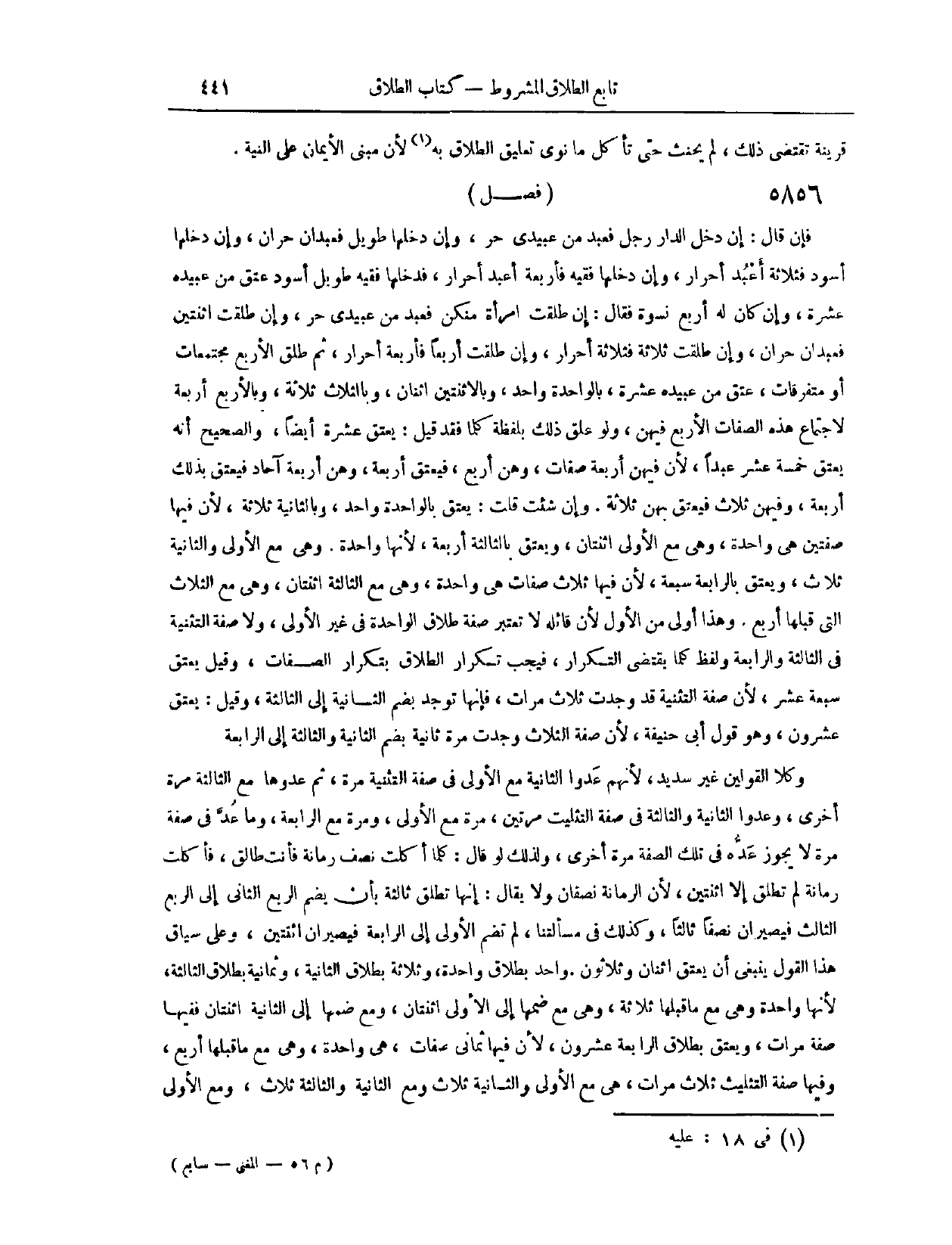 (٥٩٤٣) فَصْلٌ: فَإِنْ قَالَ: إنْ دَخَلَ الدَّارَ رَجُلٌ فَعَبْدٌ مِنْ عَبِيدِي حُرٌّ، وَإِنْ دَخَلَهَا طَوِيلٌ فَعَبْدَانِ حُرَّانِ، وَإِنْ دَخَلَهَا أَسْوَدُ فَثَلَاثَةُ أَعْبُدٍ أَحْرَارٌ، وَإِنْ دَخَلَهَا فَقِيهٌ فَأَرْبَعَةُ أَعْبُدٍ أَحْرَارٌ. فَدَخَلَهَا فَقِيهٌ طَوِيلٌ أَسْوَدُ، عَتَقَ مِنْ عَبِيدِهِ عَشَرَةٌ. وَإِنْ كَانَ لَهُ أَرْبَعُ نِسْوَةٍ، فَقَالَ: إنْ طَلَّقْت امْرَأَةً مِنْكُنَّ فَعَبْدٌ مِنْ عَبِيدِي حُرٌّ، وَإِنْ طَلَّقْت اثْنَتَيْنِ فَعَبْدَانِ حُرَّانِ، وَإِنْ طَلَّقْت ثَلَاثَةً، فَثَلَاثَةُ أَعْبُدٍ أَحْرَارٌ، وَإِنْ طَلَّقْت أَرْبَعًا، فَأَرْبَعَةُ أَعْبُدٍ أَحْرَارٌ، ثُمَّ طَلَّقَ الْأَرْبَعَ مُجْتَمِعَاتٍ أَوْ مُتَفَرِّقَاتٍ عَتَقَ مِنْ عَبِيدِهِ عَشَرَةٌ؛ بِالْوَاحِدَةِ وَاحِدٌ، وَبِالِاثْنَتَيْنِ اثْنَانِ، وَبِالثَّلَاثِ ثَلَاثَةٌ، وَبِالْأَرْبَعِ أَرْبَعَةٌ؛ لِاجْتِمَاعِ هَذِهِ الصِّفَاتِ الْأَرْبَعِ فِيهِنَّ. وَلَوْ عَلَّقَ ذَلِكَ بِلَفْظَةِ " كُلَّمَا "، فَقَدْ قِيلَ: يَعْتِقُ عَشَرَةٌ أَيْضًا.