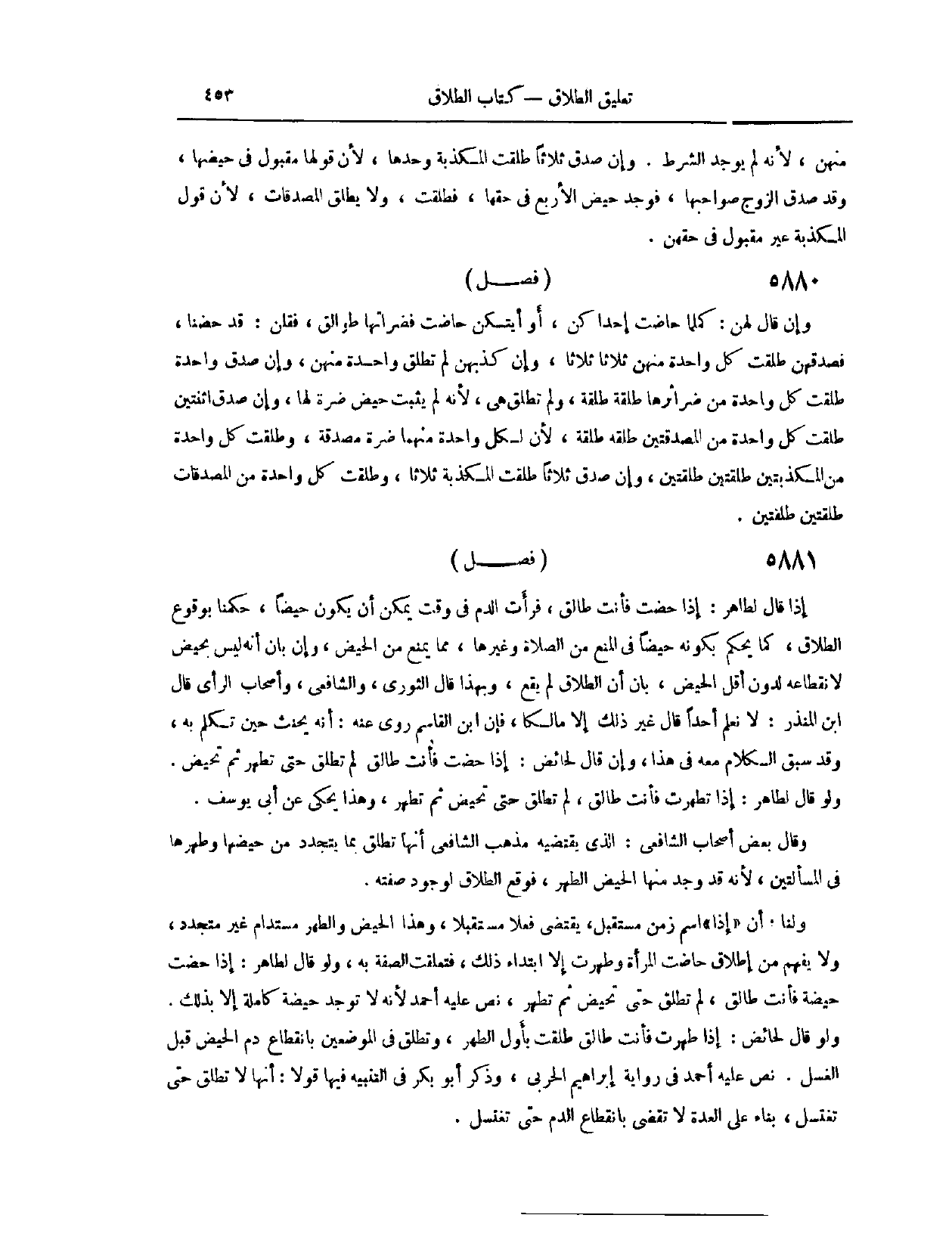 (٥٩٥٩) فَصْلٌ: إذَا قَالَ لِطَاهِرٍ: إذَا حِضْت فَأَنْتِ طَالِقٌ. فَرَأَتْ الدَّمَ فِي وَقْتٍ يُمْكِنُ أَنْ يَكُونَ حَيْضًا، حَكَمْنَا بِوُقُوعِ الطَّلَاقِ، كَمَا يُحْكَمُ بِكَوْنِهِ حَيْضًا فِي الْمَنْعِ مِنْ الصَّلَاةِ وَغَيْرِهَا مِمَّا يَمْنَعُ مِنْهُ الْحَيْضُ. وَإِنْ بَانَ أَنَّهُ لَيْسَ بِحَيْضِ، لِانْقِطَاعِهِ لِدُونِ أَقَلِّ الْحَيْضِ، بَانَ أَنَّ الطَّلَاقَ لَمْ يَقَعْ. وَبِهَذَا قَالَ الثَّوْرِيُّ، وَالشَّافِعِيُّ، وَأَصْحَابُ الرَّأْيِ. قَالَ ابْنُ الْمُنْذِرِ: لَا نَعْلَمُ أَحَدًا قَالَ غَيْرَ ذَلِكَ إلَّا مَالِكًا فَإِنَّ ابْنَ الْقَاسِمِ رَوَى عَنْهُ، أَنَّهُ يَحْنَثُ حِينَ تَكَلَّمَ بِهِ. وَقَدْ سَبَقَ الْكَلَامُ مَعَهُ فِي هَذَا. وَإِنْ قَالَ لِحَائِضٍ: إذَا حِضْت فَأَنْتِ طَالِقٌ. لَمْ تَطْلُقْ حَتَّى تَطْهُرَ ثُمَّ تَحِيضَ. وَلَوْ قَالَ لِطَاهِرٍ: إذَا طَهُرْت فَأَنْتِ طَالِقٌ. لَمْ تَطْلُقْ حَتَّى تَحِيضَ ثُمَّ تَطْهُرَ. وَهَذَا يُحْكَى عَنْ أَبِي يُوسُفَ.