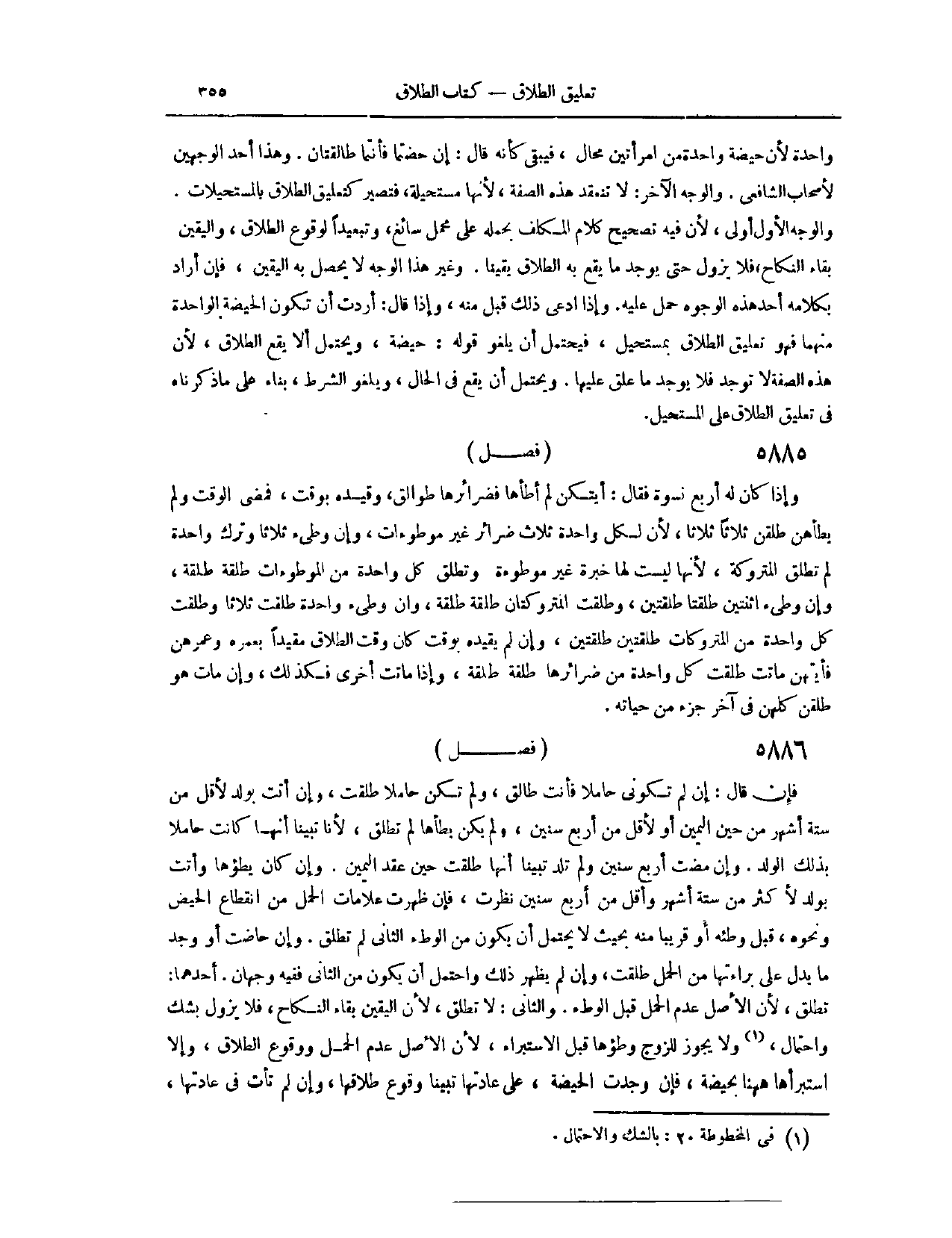 وَهَذَا أَحَدُ الْوَجْهَيْنِ لِأَصْحَابِ الشَّافِعِيِّ، وَالْوَجْهُ الْآخَرُ، لَا تَنْعَقِدُ هَذِهِ الصِّفَةُ؛ لِأَنَّهَا مُسْتَحِيلَةٌ، فَتَصِيرُ كَتَعْلِيقِ الطَّلَاقِ بِالْمُسْتَحِيلَاتِ. وَالْوَجْهُ الْأَوَّلُ أَوْلَى؛ لِأَنَّ فِيهِ تَصْحِيحَ كَلَامِ الْمُكَلَّفِ بِحَمْلِهِ عَلَى مَحْمَلٍ سَائِغٍ، وَتَبْعِيد لِوُقُوعِ الطَّلَاقِ، وَالْيَقِينُ بَقَاءُ النِّكَاحِ، فَلَا يَزُولُ حَتَّى يُوجَدَ مَا يَقَعُ بِهِ الطَّلَاقُ يَقِينًا، وَغَيْرُ هَذَا الْوَجْهِ لَا يَحْصُلُ بِهِ الْيَقِينُ. فَإِنْ أَرَادَ بِكَلَامِهِ أَحَدَ هَذِهِ الْوُجُوهِ، حُمِلَ عَلَيْهِ، وَإِذَا ادَّعَى ذَلِكَ، قُبِلَ مِنْهُ. وَإِذَا قَالَ: أَرَدْت أَنْ تَكُونَ الْحَيْضَةُ الْوَاحِدَةُ مِنْهُمَا، فَهُوَ تَعْلِيقٌ لِلطَّلَاقِ بِمُسْتَحِيلِ، فَيَحْتَمِلُ أَنْ يَلْغُوَ قَوْلُهُ: حَيْضَةً. وَيَحْتَمِلُ أَنْ لَا يَقَعَ الطَّلَاقُ؛ لِأَنَّ هَذِهِ الصِّفَةَ لَا تُوجَدُ، فَلَا يُوجَدُ مَا عُلِّقَ عَلَيْهَا، وَيَحْتَمِلُ أَنْ يَقَعَ الطَّلَاقُ فِي الْحَالِ، وَيَلْغُوَ الشَّرْطُ، بِنَاءً عَلَى مَا ذَكَرْنَاهُ فِي تَعْلِيقِ الطَّلَاقِ عَلَى الْمُسْتَحِيلِ.