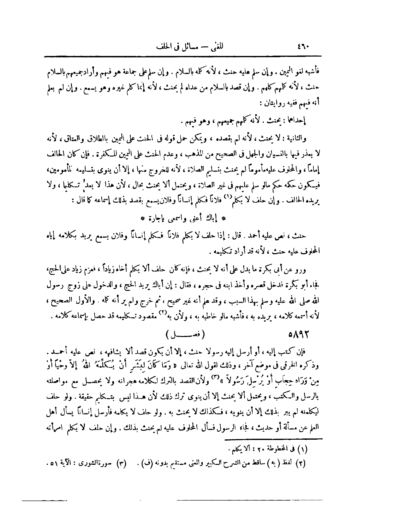 فَصْلٌ: فَإِنْ كَتَبَ إلَيْهِ، أَوْ أَرْسَلَ إلَيْهِ رَسُولًا، حَنِثَ، إلَّا أَنْ يَكُونَ قَصَدَ أَنْ لَا يُشَافِهَهُ. نَصَّ عَلَيْهِ أَحْمَدُ، وَذَكَرَهُ الْخِرَقِيِّ [فِي] مَوْضِعٍ آخَرَ، وَذَلِكَ لِقَوْلِ اللَّهِ تَعَالَى: {وَمَا كَانَ لِبَشَرٍ أَنْ يُكَلِّمَهُ اللَّهُ إِلا وَحْيًا أَوْ مِنْ وَرَاءِ حِجَابٍ أَوْ يُرْسِلَ رَسُولا} [الشورى: ٥١] . وَلِأَنَّ الْقَصْدَ بِالتَّرْكِ لِكَلَامِهِ هِجْرَانُهُ، وَلَا يَحْصُلُ مَعَ مُوَاصَلَتِهِ بِالرُّسُلِ وَالْكُتُبِ. وَيَحْتَمِلُ أَنْ لَا يَحْنَثَ إلَّا أَنْ يَنْوِيَ تَرْكَ ذَلِكَ؛ لِأَنَّ هَذَا لَيْسَ بِتَكْلِيمٍ حَقِيقَةً، وَلَوْ حَلَفَ لِيُكَلِّمْنَهُ، لَمْ يَبَرَّ بِذَلِكَ، إلَّا أَنْ يَنْوِيَهُ، فَكَذَلِكَ لَا يَحْنَث بِهِ. وَلَوْ حَلَفَ لَا يُكَلِّمُهُ، فَأَرْسَلَ إنْسَانًا يَسْأَلُ أَهْلَ الْعِلْمِ عَنْ مَسْأَلَةٍ أَوْ حَدِيثٍ، فَجَاءَ الرَّسُولُ، فَسَأَلَ الْمَحْلُوفَ عَلَيْهِ، لَمْ يَحْنَثْ بِذَلِكَ.