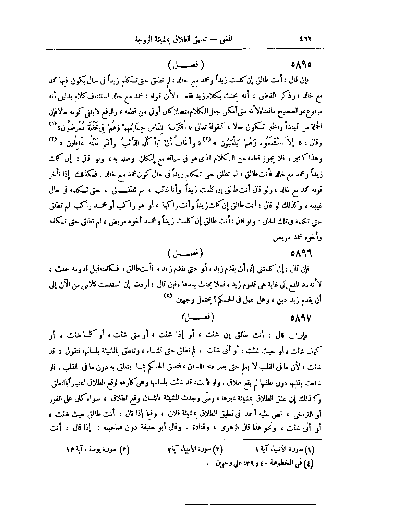 فَصْلٌ: فَإِنْ قَالَ: أَنْتِ طَالِقٌ إنْ كَلَّمْت زَيْدًا، وَمُحَمَّدٌ مَعَ خَالِدٍ. لَمْ تَطْلُقْ حَتَّى تُكَلِّمَ زَيْدًا فِي حَالٍ يَكُونُ فِيهِ مُحَمَّدٌ مَعَ خَالِدٍ. وَذَكَر الْقَاضِي أَنَّهُ يَحْنَثُ بِكَلَامِ زَيْدٍ فَقَطْ؛ لِأَنَّ قَوْلَهُ: مُحَمَّدٌ مَعَ خَالِدٍ اسْتِئْنَافُ كَلَامٍ؛ بِدَلِيلِ أَنَّهُ مَرْفُوعٌ. وَالصَّحِيحُ مَا قُلْنَا؛ لِأَنَّهُ مَتَى أَمْكَنَ جَعْلُ الْكَلَامِ مُتَّصِلًا كَانَ أَوْلَى مِنْ قَطْعِهِ، وَالرَّفْعُ لَا يَنْفِي كَوْنَهُ حَالًا، فَإِنَّ الْجُمْلَةَ مِنْ الْمُبْتَدَإِ وَالْخَبَرِ تَكُونُ حَالًا، كَقَوْلِهِ تَعَالَى: {اقْتَرَبَ لِلنَّاسِ حِسَابُهُمْ وَهُمْ فِي غَفْلَةٍ مُعْرِضُونَ} [الأنبياء: ١] . وَقَالَ: {إِلا اسْتَمَعُوهُ وَهُمْ يَلْعَبُونَ} [الأنبياء: ٢] . {وَأَخَافُ أَنْ يَأْكُلَهُ الذِّئْبُ وَأَنْتُمْ عَنْهُ غَافِلُونَ} [يوسف: ١٣] . وَهَذَا كَثِيرٌ، فَلَا يَجُوزُ قَطْعُهُ عَنْ الْكَلَامِ الَّذِي هُوَ فِي سِيَاقِهِ مَعَ إمْكَانِ وَصْلِهِ بِهِ، وَلَوْ قَالَ: إنْ كَلَّمْت زَيْدًا وَمُحَمَّدٌ مَعَ خَالِدٍ فَأَنْتِ طَالِقٌ. لَمْ تَطْلُق حَتَّى تُكَلِّمَ زَيْدًا فِي حَالِ كَوْنِ مُحَمَّدٍ مَعَ خَالِدٍ، فَكَذَلِكَ إذَا تَأَخَّرَ قَوْلُهُ: مُحَمَّدٌ مَعَ خَالِدٍ.