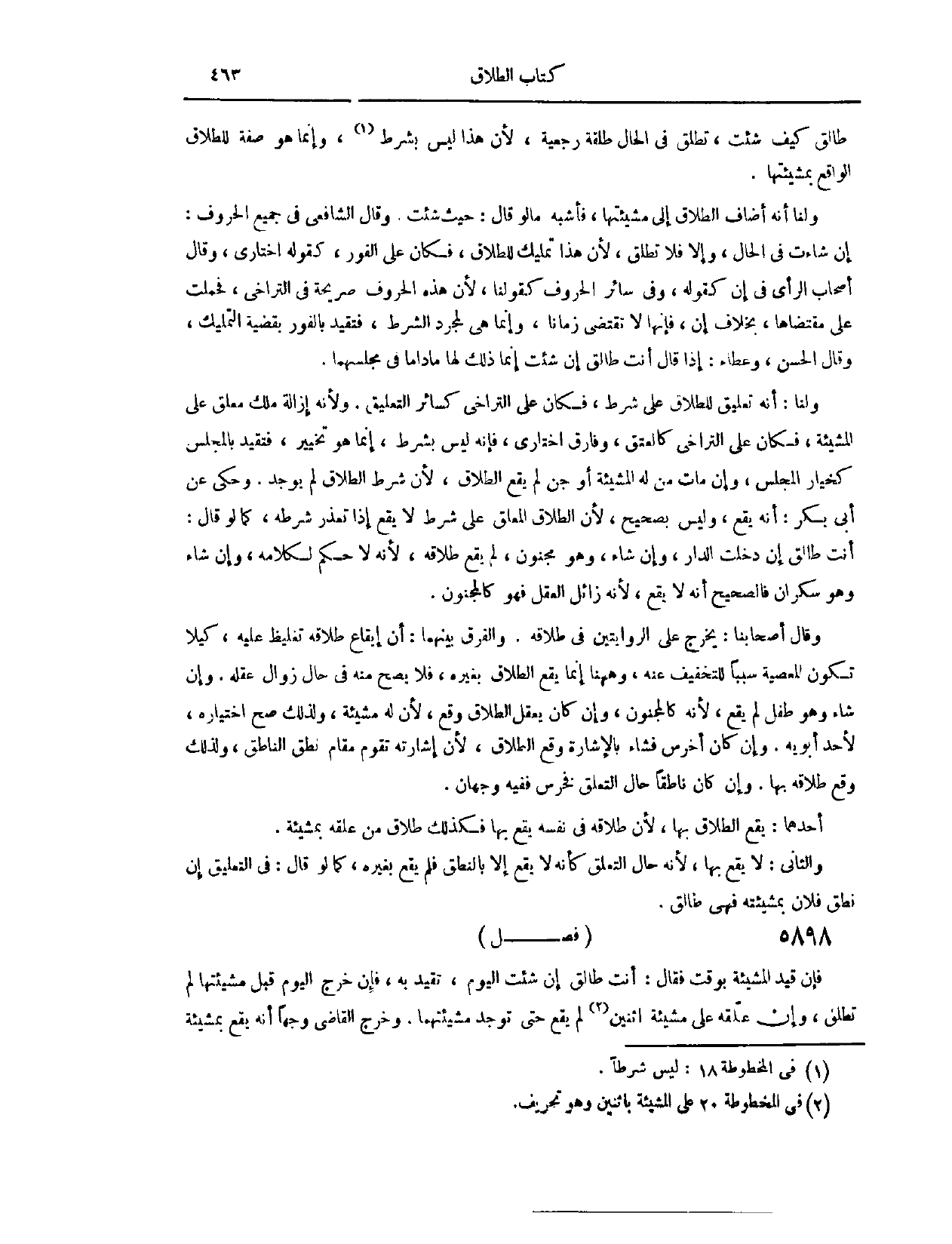 وَقَالَ أَصْحَابُنَا: يُخَرَّجُ عَلَى الرِّوَايَتَيْنِ فِي طَلَاقِهِ، وَالْفَرْقُ بَيْنَهُمَا أَنَّ إيقَاعَ طَلَاقِهِ تَغْلِيظٌ عَلَيْهِ، كَيْ لَا تَكُونَ الْمَعْصِيَةُ سَبَبًا لِلتَّخْفِيفِ عَنْهُ، وَهَاهُنَا إنَّمَا يَقَعُ الطَّلَاقُ بِغَيْرِهِ، فَلَا يَصِحُّ مِنْهُ فِي حَالِ زَوَالِ عَقْلِهِ، وَإِنْ شَاءَ، وَهُوَ طِفْلٌ، لَمْ يَقَعْ؛ لِأَنَّهُ كَالْمَجْنُونِ. وَإِنْ كَانَ يَعْقِلُ الطَّلَاقَ، وَقَعَ؛ لِأَنَّ لَهُ مَشِيئَةً، وَلِذَلِكَ صَحَّ اخْتِيَارُهُ لِأَحَدِ أَبَوَيْهِ. وَإِنْ كَانَ أَخْرَسَ، فَشَاءَ بِالْإِشَارَةِ، وَقَعَ الطَّلَاقُ؛ لِأَنَّ إشَارَتَهُ تَقُومُ مَقَامَ نُطْقِ النَّاطِقِ، وَلِذَلِكَ وَقَعَ طَلَاقُهُ بِهَا، وَإِنْ كَانَ نَاطِقًا حَالَ التَّعْلِيقِ، فَخَرِسَ، فَفِيهِ وَجْهَانِ؛ أَحَدُهُمَا، يَقَعُ الطَّلَاقُ بِهَا؛ لِأَنَّ طَلَاقَهُ فِي نَفْسِهِ يَقَعُ بِهَا، فَكَذَلِكَ طَلَاقُ مَنْ عَلَّقَهُ بِمَشِيئَةٍ. وَالثَّانِي، لَا يَقَعُ بِهَا؛ لِأَنَّهُ حَالَ التَّعْلِيقِ، كَانَ لَا يَقَعُ إلَّا بِالنُّطْقِ، فَلَمْ يَقَعْ بِغَيْرِهِ، كَمَا لَوْ قَالَ فِي التَّعْلِيقِ: إنْ نَطَقَ فُلَانٌ بِمَشِيئَتِهِ فَهِيَ طَالِقٌ.