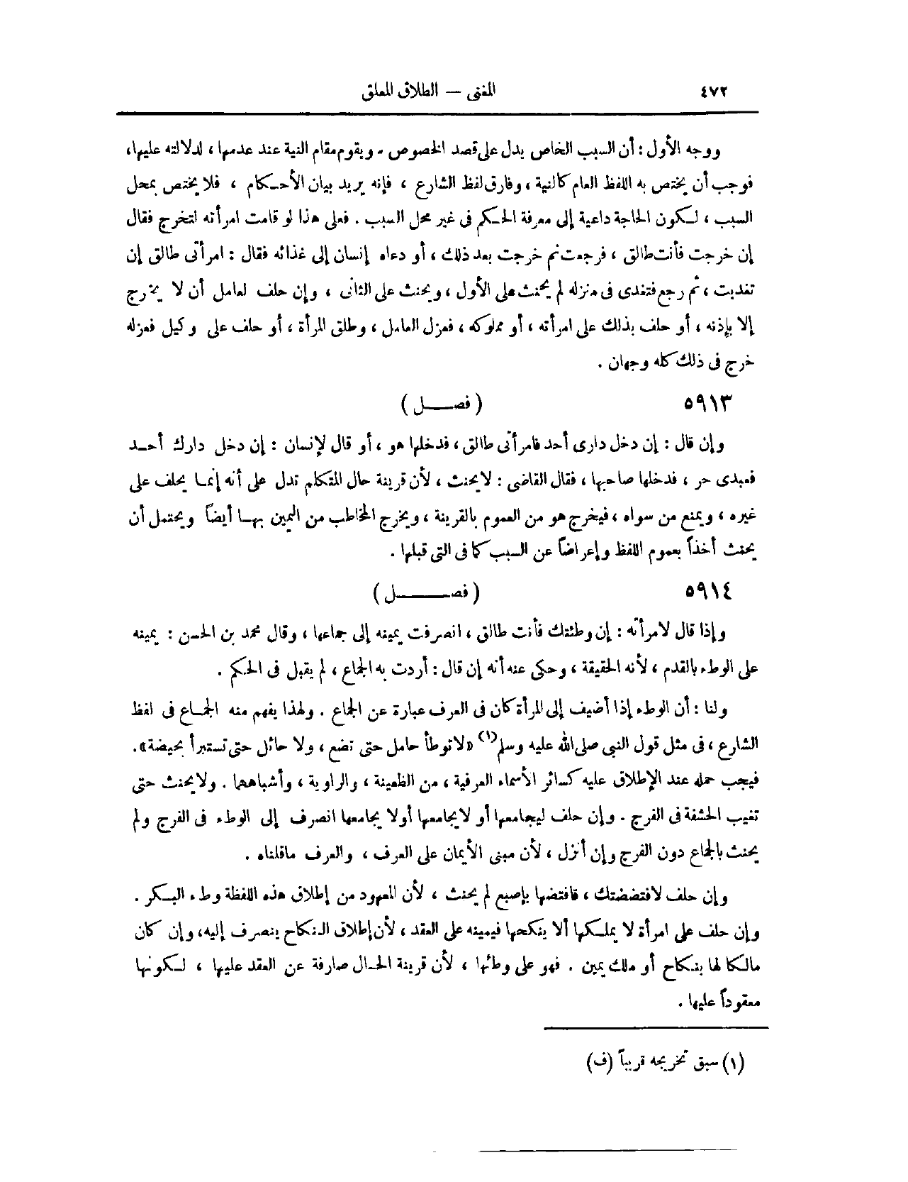 دَاعِيَةً إلَى مَعْرِفَةِ الْحُكْمِ فِي غَيْرِ مَحَلِّ السَّبَبِ. فَعَلَى هَذَا، لَوْ قَامَتْ امْرَأَتُهُ لِتَخْرُجَ، فَقَالَ: إنْ خَرَجْت فَأَنْتِ طَالِقٌ. فَرَجَعَتْ، ثُمَّ خَرَجَتْ بَعْد ذَلِكَ، أَوْ دَعَاهُ إنْسَانٌ إلَى غَدَائِهِ، فَقَالَ: امْرَأَتِي طَالِقٌ إنْ تَغَدَّيْت. ثُمَّ رَجَعَ فَتَغَدَّى فِي مَنْزِلِهِ، لَمْ يَحْنَثْ عَلَى الْأَوَّلِ، وَيَحْنَثُ عَلَى الثَّانِي.