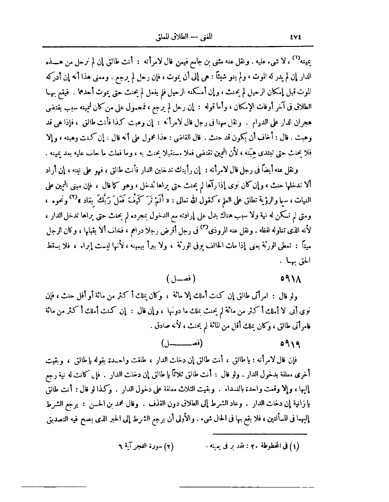 (٥٩٩٦) فَصْلٌ: وَلَوْ قَالَ: امْرَأَتِي طَالِقٌ، إنْ كُنْت أَمْلِكُ إلَّا مِائَةً. وَكَانَ يَمِلْك أَكْثَرَ مِنْ مِائَةٍ، أَوْ أَقَلِّ، حَنِثَ. فَإِنْ نَوَى أَنِّي لَا أَمْلِكُ أَكْثَرَ مِنْ مِائَةٍ، لَمْ يَحْنَثْ بِمِلْكِ مَا دُونَهَا. وَإِنْ قَالَ: إنْ كُنْت أَمْلِكُ أَكْثَرَ مِنْ مِائَةٍ، فَامْرَأَتِي طَالِقٌ. وَكَانَ يَمْلِكُ أَقَلَّ مِنْ الْمِائَةِ، لَمْ يَحْنَثْ؛ لِأَنَّهُ صَادِقٌ.