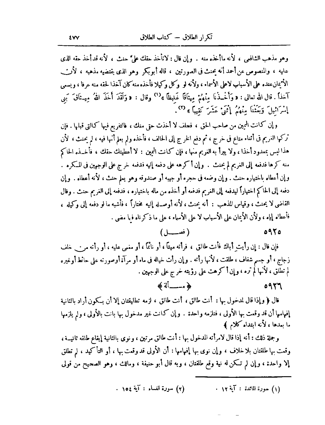 وَالْمَنْصُوصُ عَنْ أَحْمَدَ، أَنَّهُ يَحْنَثُ فِي الصُّورَتَيْنِ. قَالَهُ أَبُو بَكْرٍ وَهُوَ الَّذِي يَقْتَضِيه مَذْهَبُهُ؛ لِأَنَّ الْأَيْمَانَ عِنْدَهُ عَلَى الْأَسْبَابِ، لَا عَلَى الْأَسْمَاءِ، وَلِأَنَّهُ لَوْ وَكَّلَ وَكِيلًا، فَأَخَذَهُ مِنْهُ، كَانَ آخِذًا لِحَقِّهِ مِنْهُ عُرْفًا، وَيُسَمَّى آخِذًا؛ قَالَ اللَّهُ تَعَالَى: {وَأَخَذْنَا مِنْهُمْ مِيثَاقًا غَلِيظًا} [النساء: ١٥٤] . وَقَالَ: {وَلَقَدْ أَخَذَ اللَّهُ مِيثَاقَ بَنِي إِسْرَائِيلَ وَبَعَثْنَا مِنْهُمُ اثْنَيْ عَشَرَ نَقِيبًا} [المائدة: ١٢] . وَإِنْ كَانَتْ الْيَمِينُ مِنْ صَاحِبِ الْحَقِّ، فَحَلَفَ: لَا أَخَذْت حَقِّي مِنْك. فَالتَّفْرِيعُ فِيهَا كَاَلَّتِي قَبْلَهَا. فَإِنْ تَرَكَهَا الْغَرِيمُ فِي أَثْنَاءِ مَتَاعٍ فِي خُرْجٍ، ثُمَّ دَفَعَ الْخُرْجَ إلَى الْحَالِفِ، فَأَخَذَهُ وَلَمْ يَعْلَمْ أَنَّهَا فِيهِ، لَمْ يَحْنَثْ؛ لِأَنَّ هَذَا لَيْسَ بِمَعْدُودٍ أَخْذًا، وَلَا يَبْرَأُ بِهِ الْغَرِيمُ مِنْهَا. فَإِنْ كَانَتْ الْيَمِينُ: لَا أُعْطِيتُك حَقَّك، فَأَخَذَهُ الْحَاكِمُ مِنْهُ كُرْهًا، فَدَفَعَهُ إلَى الْغَرِيم، لَمْ يَحْنَثْ.