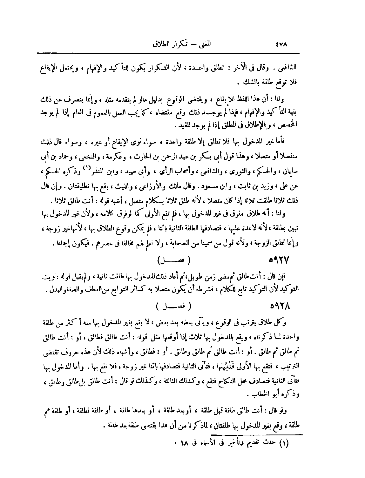 فَصْلٌ: وَكُلُّ طَلَاقٍ يَتَرَتَّبُ فِي الْوُقُوعِ، وَيَأْتِي بَعْضُهُ بَعْدَ بَعْضٍ، لَا يَقَعُ بِغَيْرِ الْمَدْخُولِ بِهَا مِنْهُ أَكْثَرُ مِنْ طَلْقَةٍ وَاحِدَةٍ؛ لِمَا ذَكَرْنَاهُ. وَيَقَعُ بِالْمَدْخُولِ بِهَا ثَلَاثٌ إذَا أَوْقَعَهَا، مِثْل قَوْلِهِ: أَنْتِ طَالِقٌ، فَطَالِقٌ، فَطَالِقٌ. أَوْ: أَنْتِ طَالِقٌ، ثُمَّ طَالِقٌ، ثُمَّ طَالِقٌ. أَوْ: أَنْتِ طَالِقٌ ثُمَّ طَالِقٌ وَطَالِقٌ. أَوْ: فَطَالِقٌ. وَأَشْبَاهُ ذَلِكَ؛ لِأَنَّ هَذِهِ حُرُوفٌ تَقْتَضِي التَّرْتِيبَ، فَتَقَعُ بِهَا الْأُولَى فَتُبِينُهَا، فَتَأْتِي الثَّانِيَةُ فَتُصَادِفُهَا بَائِنًا غَيْرَ زَوْجَةٍ، فَلَا تَقَعُ بِهَا. وَأَمَّا الْمَدْخُولُ بِهَا، فَتَأْتِي الثَّانِيَةُ فَتُصَادِفُ مَحَلَّ النِّكَاحِ، فَتَقَعُ، وَكَذَلِكَ الثَّالِثَةُ. وَكَذَلِكَ لَوْ قَالَ: أَنْتِ طَالِقٌ، بَلْ، طَالِقٌ، وَطَالِقٌ. ذَكَرَهُ أَبُو الْخَطَّابِ. وَلَوْ قَالَ: أَنْتِ طَالِقٌ طَلْقَةً قَبْلَ طَلْقَةٍ. أَوْ: بَعْدَ طَلْقَةٍ. أَوْ بَعْدَهَا طَلْقَةٌ. أَوْ: طَلْقَةً فَطَلْقَةً. أَوْ: طَلْقَةً ثُمَّ طَلْقَةً. وَقَعَ بِغَيْرِ الْمَدْخُولِ بِهَا طَلْقَةٌ، وَبِالْمَدْخُولِ بِهَا طَلْقَتَانِ؛ لِمَا ذَكَرْنَا مِنْ أَنَّ هَذَا يَقْتَضِي طَلْقَةً بَعْدَ طَلْقَةٍ.