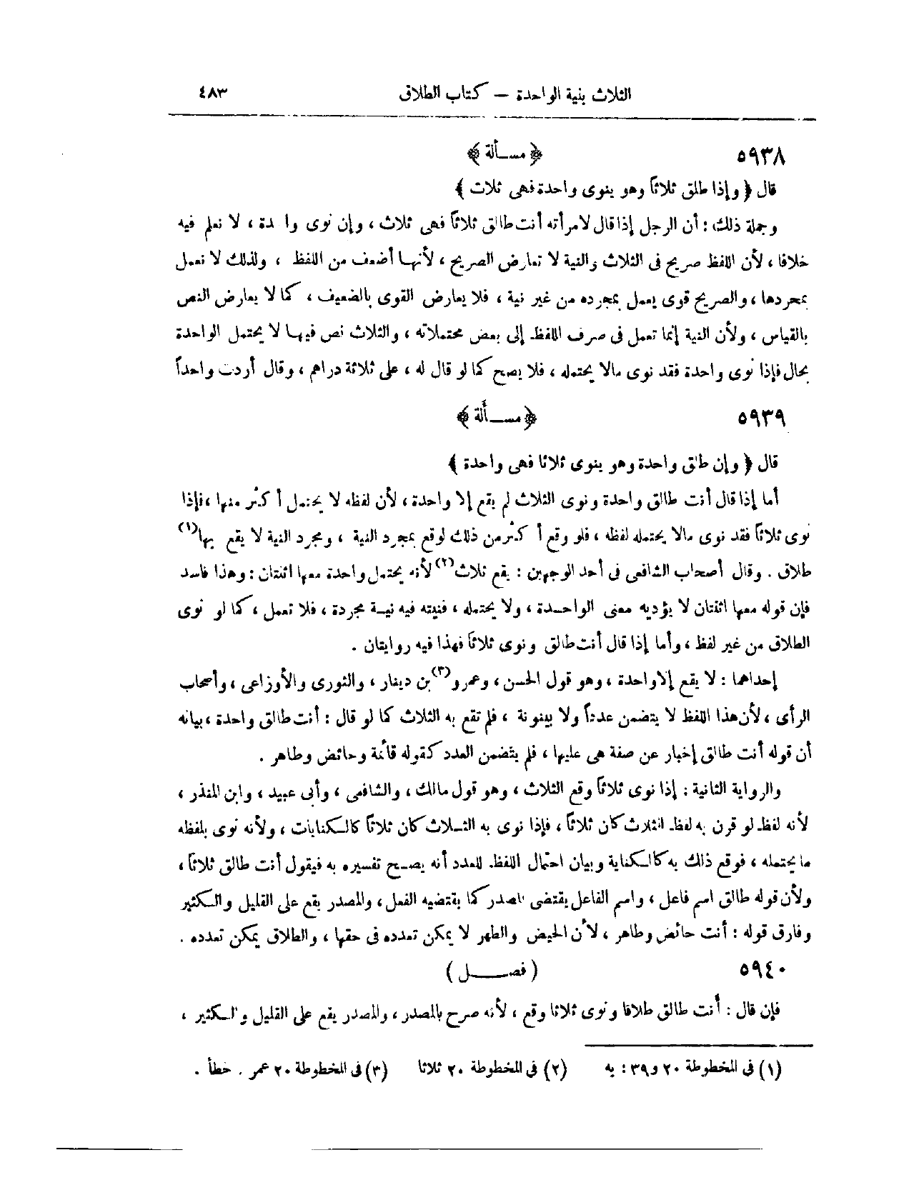 (٦٠١٦) مَسْأَلَةٌ؛ قَالَ: (وَإِذَا طَلَّقَ ثَلَاثًا، وَهُوَ يَنْوِي وَاحِدَةً، فَهِيَ ثَلَاثٌ) وَجُمْلَةُ ذَلِكَ أَنَّ الرَّجُلَ إذَا قَالَ لِامْرَأَتِهِ: أَنْتِ طَالِقٌ ثَلَاثًا. فَهِيَ ثَلَاثٌ، وَإِنْ نَوَى وَاحِدَةً، لَا نَعْلَمُ فِيهِ خِلَافًا؛ لِأَنَّ اللَّفْظَ صَرِيحٌ فِي الثَّلَاثِ، وَالنِّيَّةُ لَا تُعَارِضُ الصَّرِيحَ؛ لِأَنَّهَا أَضْعَفُ مِنْ اللَّفْظِ، وَلِذَلِكَ لَا نَعْمَلُ بِمُجَرَّدِهَا، وَالصَّرِيحُ قَوِيٌّ يُعْمَلُ بِمُجَرَّدِهِ، مِنْ غَيْرِ نِيَّةٍ، فَلَا يُعَارَضُ الْقَوِيُّ بِالضَّعِيفِ، كَمَا لَا يُعَارَضُ النَّصُّ بِالْقِيَاسِ، وَلِأَنَّ النِّيَّةَ إنَّمَا تَعْمَلُ فِي صَرْفِ اللَّفْظِ إلَى بَعْضِ مُحْتَمِلَاتِهِ، وَالثَّلَاثُ نَصٌّ فِيهَا، لَا يَحْتَمِلُ الْوَاحِدَةَ بِحَالٍ، فَإِذَا نَوَى وَاحِدَةً، فَقَدْ نَوَى مَا لَا يَحْتَمِلُهُ، فَلَا يَصِحُّ، كَمَا لَوْ قَالَ: لَهُ عَلَيَّ ثَلَاثَةُ دَرَاهِمَ. وَقَالَ: أَرَدْت وَاحِدًا.