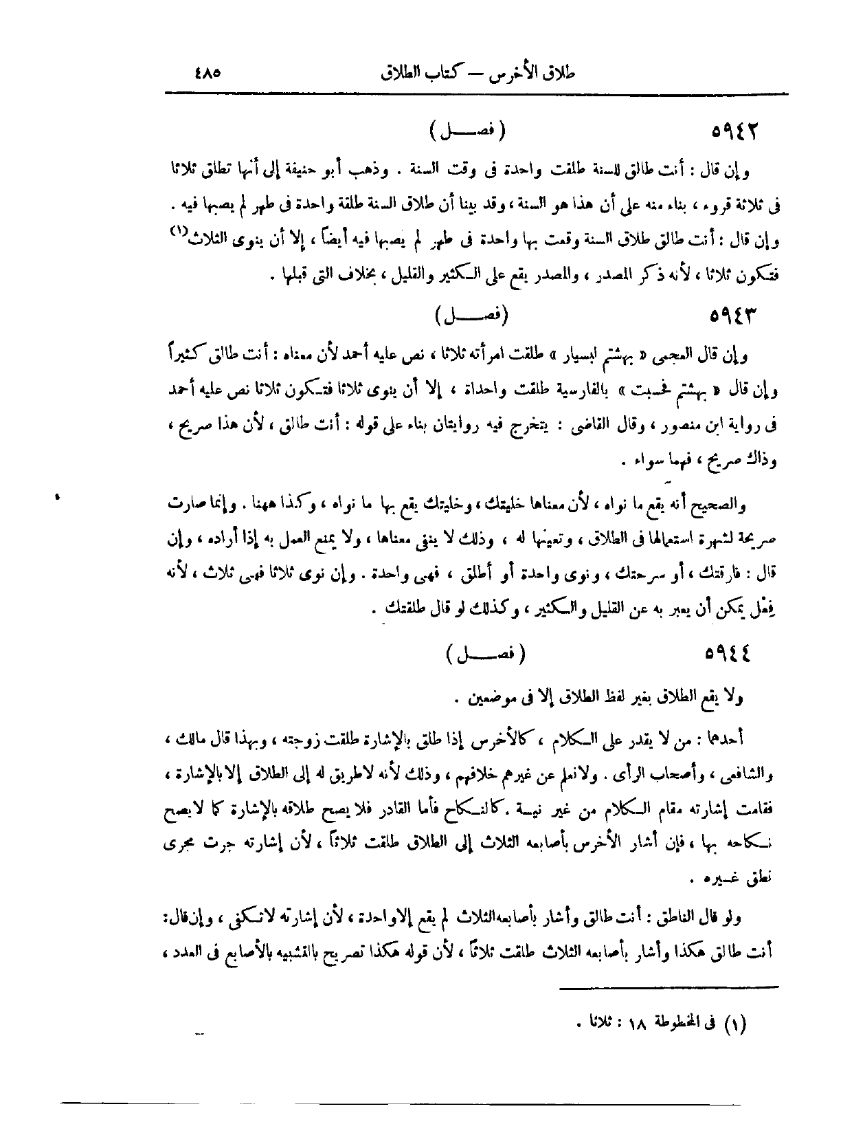 (٦٠٢١) فَصْلٌ: وَإِنْ قَالَ الْعَجَمِيُّ: بهشتم لبسيار. طَلُقَتْ امْرَأَتُهُ ثَلَاثًا. نَصَّ عَلَيْهِ أَحْمَدُ؛ لِأَنَّ مَعْنَاهُ: أَنْتِ طَالِقٌ كَثِيرًا. وَإِنْ قَالَ: بهشتم. فَحَسْبُ، طَلُقَتْ وَاحِدَةً، إلَّا أَنْ يَنْوِيَ ثَلَاثًا، فَتَكُونَ ثَلَاثًا. نَصَّ عَلَيْهِ أَحْمَدُ، فِي رِوَايَةِ ابْنِ مَنْصُورٍ. وَقَالَ الْقَاضِي: يَتَخَرَّجُ فِيهِ رِوَايَتَانِ؛ بِنَاءً عَلَى قَوْلِهِ: أَنْتِ طَالِقٌ؛ لِأَنَّ هَذَا صَرِيحٌ، وَذَاكَ صَرِيحٌ، فَهُمَا سَوَاءٌ. وَالصَّحِيحُ أَنَّهُ يَقَعُ مَا نَوَاهُ؛ لِأَنَّ مَعْنَاهَا خَلَّيْتُك، وَخَلَّيْتُك يَقَعُ بِهَا مَا نَوَاهُ، وَكَذَا هَاهُنَا، وَإِنَّمَا صَارَتْ صَرِيحَةً لِشُهْرَةِ اسْتِعْمَالِهَا فِي الطَّلَاقِ، وَتَعَيُّنِهَا لَهُ، وَذَلِكَ لَا يَنْفِي مَعْنَاهَا، وَلَا يَمْنَعُ الْعَمَلَ بِهِ إذَا أَرَادَهُ. وَإِنْ قَالَ: فَارَقَتْك. أَوْ: سَرَّحْتُكِ. وَنَوَى وَاحِدَةً، أَوْ أَطْلَقَ، فَهِيَ وَاحِدَةٌ. وَإِنْ نَوَى ثَلَاثًا، فَهِيَ ثَلَاثٌ؛ لِأَنَّهُ فِعْلٌ يُمْكِنُ أَنْ يُعَبَّرَ بِهِ عَنْ الْقَلِيلِ وَالْكَثِيرِ، وَكَذَلِكَ لَوْ قَالَ: طَلَّقْتُكِ.