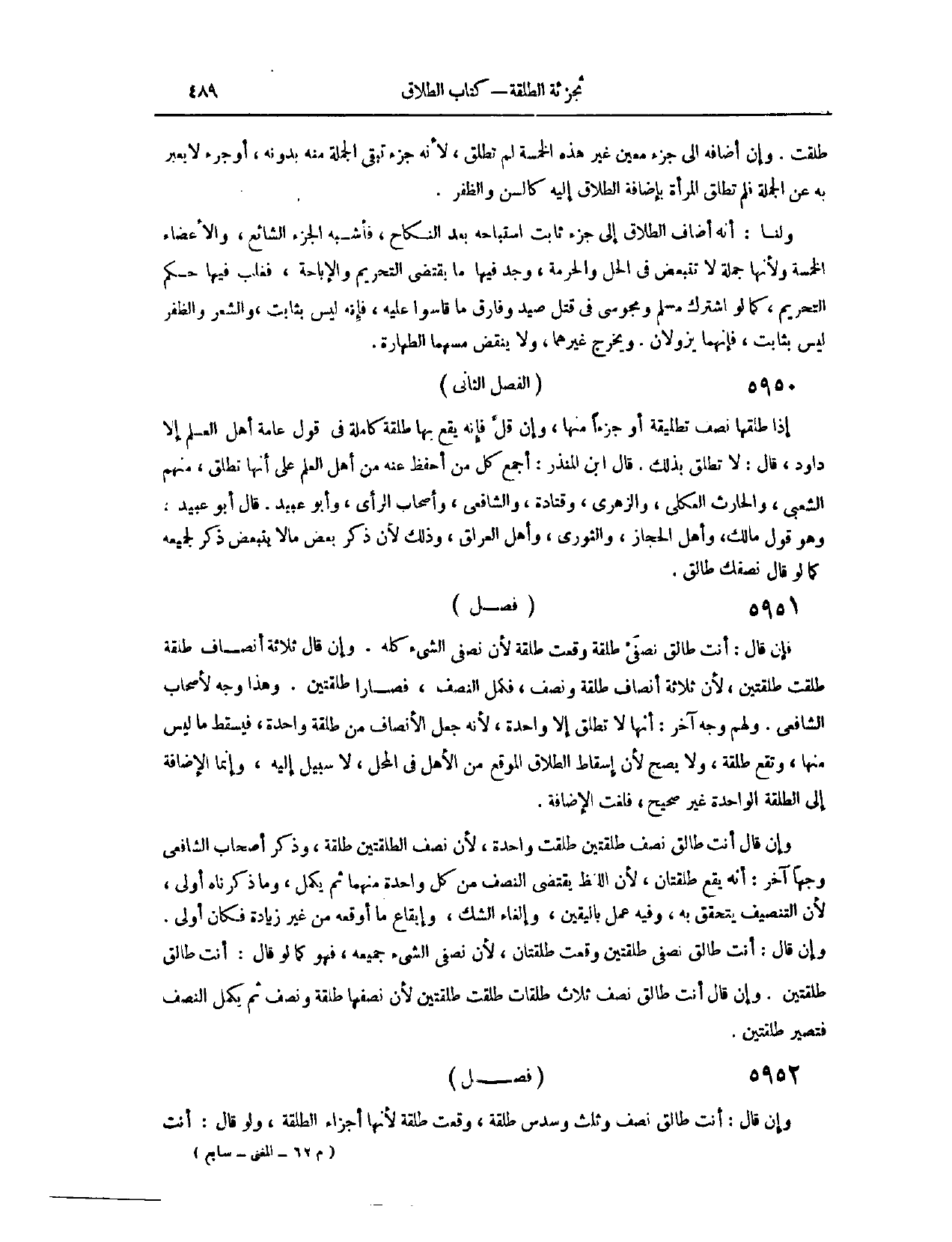 (٦٠٢٨) الْفَصْلُ الثَّانِي: إذَا طَلَّقَهَا نِصْفَ تَطْلِيقَةٍ أَوْ جُزْءًا مِنْهَا وَإِنْ قَلَّ فَإِنَّهُ يَقَعُ بِهَا طَلْقَةٌ كَامِلَةٌ فِي قَوْلِ عَامَّةِ أَهْلِ الْعِلْمِ إلَّا دَاوُد قَالَ: لَا تَطْلُقْ بِذَلِكَ قَالَ ابْنُ الْمُنْذِرِ: أَجْمَعَ كُلُّ مَنْ أَحْفَظُ عَنْهُ مِنْ أَهْلِ الْعِلْمِ عَلَى أَنَّهَا تَطْلُقُ بِذَلِكَ؛ مِنْهُمْ الشَّعْبِيُّ وَالْحَارِثُ الْعُكْلِيُّ وَالزُّهْرِيُّ وَقَتَادَةُ وَالشَّافِعِيُّ وَأَصْحَابُ الرَّأْيِ وَأَبُو عُبَيْدٍ قَالَ أَبُو عُبَيْدٍ: وَهُوَ قَوْلُ مَالِكٍ وَأَهْلِ الْحِجَازِ وَالثَّوْرِيِّ وَأَهْلِ الْعِرَاقِ وَذَلِكَ لِأَنَّ ذِكْرَ بَعْضِ مَا لَا يَتَبَعَّضُ فِي الطَّلَاقِ ذِكْرٌ لِجَمِيعِهِ كَمَا لَوْ قَالَ: نِصْفُك طَالِقٌ.