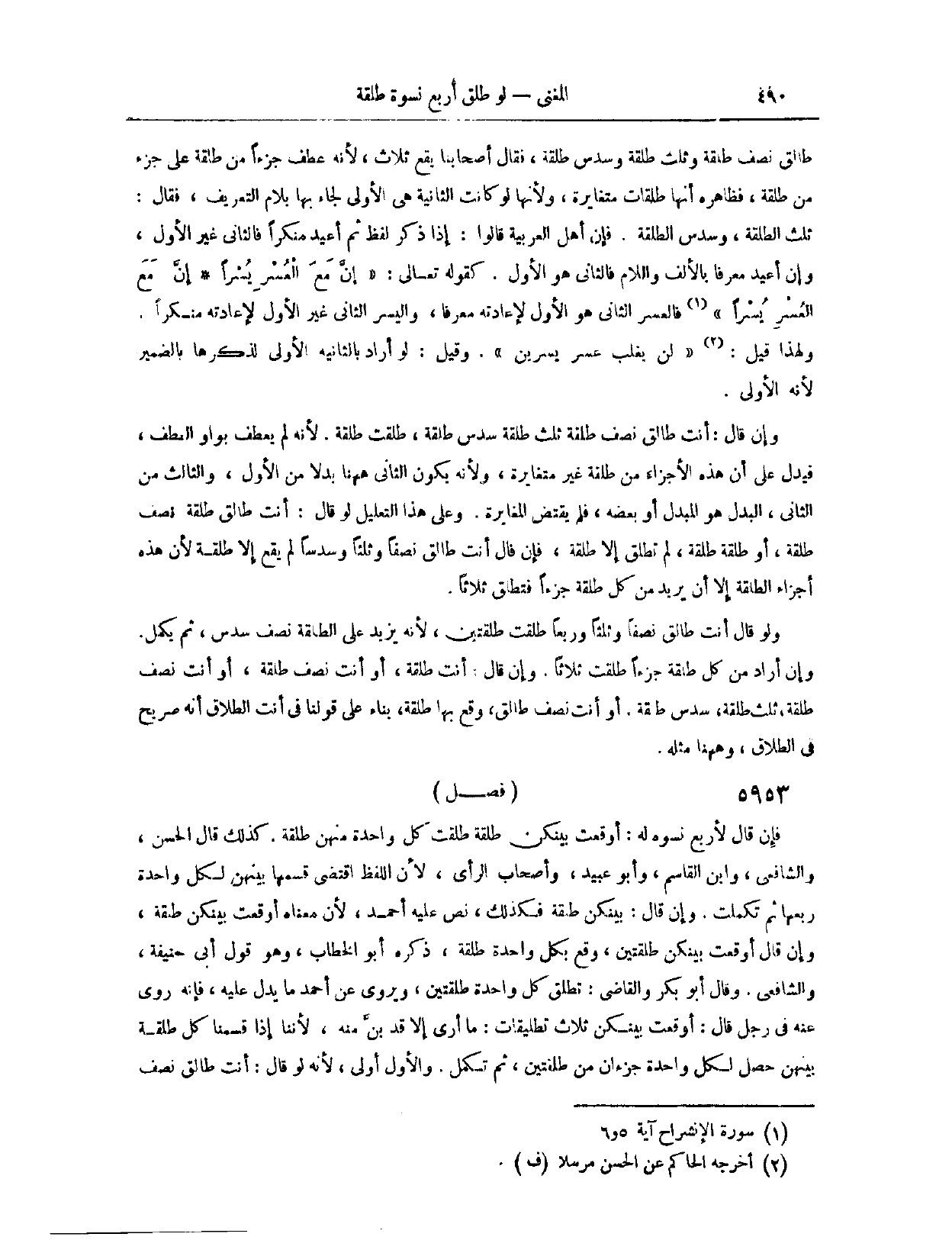 طَالِقٌ نِصْفَ طَلْقَةٍ وَثُلُثَ طَلْقَةٍ وَسُدْسَ طَلْقَةٍ فَقَالَ أَصْحَابُنَا: يَقَعُ ثَلَاثٌ؛ لِأَنَّهُ عَطَفَ جُزْءًا مِنْ طَلْقَةٍ عَلَى جُزْءٍ مِنْ طَلْقَةٍ فَظَاهِرُهُ أَنَّهَا طَلَقَاتٌ مُتَغَايِرَةٌ وَلِأَنَّهَا لَوْ كَانَتْ الثَّانِيَةُ هِيَ الْأُولَى لَجَاءَ بِهَا فَاللَّامُ التَّعْرِيفِ فَقَالَ: ثُلُثَ الطَّلْقَةِ وَسُدْسَ الطَّلْقَةِ فَإِنَّ أَهْلَ الْعَرَبِيَّةِ قَالُوا: إذَا ذُكِرَ لَفْظٌ ثُمَّ أُعِيدَ مُنَكَّرًا فَالثَّانِي غَيْرُ الْأَوَّلِ وَإِنْ أُعِيدَ مُعَرَّفًا بِالْأَلِفِ وَاللَّامِ فَالثَّانِي هُوَ الْأَوَّلُ كَقَوْلِهِ تَعَالَى: {فَإِنَّ مَعَ الْعُسْرِ يُسْرًا} [الشرح: ٥] {إِنَّ مَعَ الْعُسْرِ يُسْرًا} [الشرح: ٦] فَالْعُسْرُ الثَّانِي هُوَ الْأَوَّلُ؛ لِإِعَادَتِهِ مُعَرَّفًا وَالْيُسْرُ الثَّانِي غَيْرُ الْأَوَّلِ؛ لِإِعَادَتِهِ مُنْكَرًا وَلِهَذَا قِيلَ: لَنْ يَغْلِبَ عُسْرٌ يُسْرَيْنَ