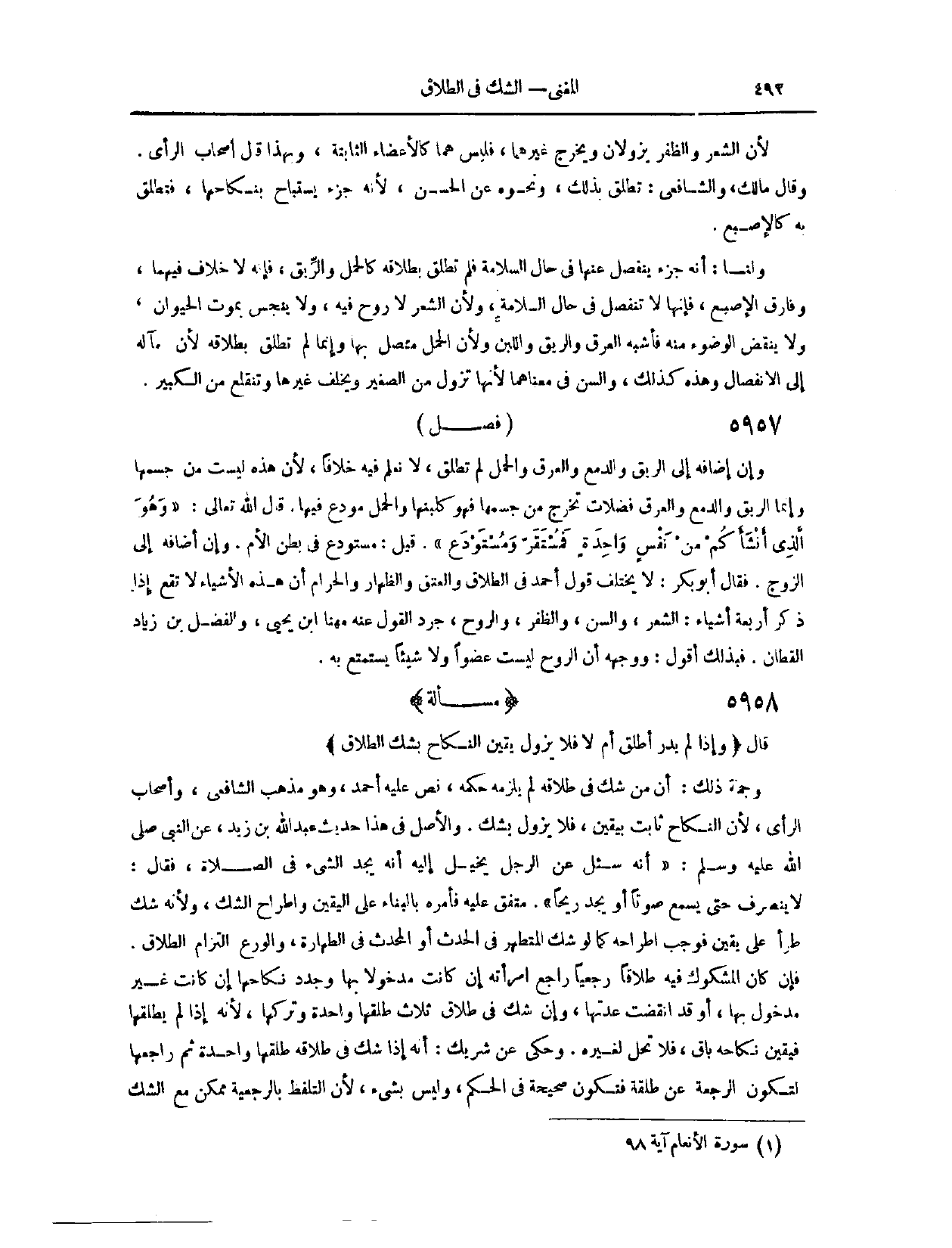 (٦٠٣٦) مَسْأَلَةٌ؛ قَالَ: (وَإِذَا لَمْ يَدْرِ أَطَلَّقَ أَمْ لَا فَلَا يَزُولُ يَقِينُ النِّكَاحِ بِشَكِّ الطَّلَاقِ) وَجُمْلَةُ ذَلِكَ أَنَّ مَنْ شَكَّ فِي طَلَاقِهِ لَمْ يَلْزَمْهُ حُكْمُهُ نَصَّ عَلَيْهِ أَحْمَدُ وَهُوَ مَذْهَبُ الشَّافِعِيِّ وَأَصْحَابُ الرَّأْيِ؛ لِأَنَّ النِّكَاحَ ثَابِتٌ بِيَقِينٍ فَلَا يَزُولُ بِشَكٍّ وَالْأَصْلُ فِي هَذَا حَدِيثُ عَبْدِ اللَّهِ بْنِ زَيْدٍ عَنْ «النَّبِيِّ - صَلَّى اللَّهُ عَلَيْهِ وَسَلَّمَ - أَنَّهُ سُئِلَ عَنْ الرَّجُلِ يُخَيَّلُ إلَيْهِ أَنَّهُ يَجِدُ الشَّيْءَ فِي الصَّلَاةِ فَقَالَ: لَا يَنْصَرِفُ حَتَّى يَسْمَعَ صَوْتًا أَوْ يَجِدَ رِيحًا» مُتَّفَقٌ عَلَيْهِ فَأَمَرَهُ بِالْبِنَاءِ عَلَى الْيَقِينِ وَاطِّرَاحِ الشَّكِّ وَلِأَنَّهُ شَكٌّ طَرَأَ عَلَى يَقِينٍ فَوَجَبَ اطِّرَاحُهُ كَمَا لَوْ شَكَّ الْمُتَطَهِّرُ فِي الْحَدَثِ أَوْ الْمُحْدِثُ فِي الطَّهَارَةِ، وَالْوَرَعُ الْتِزَامُ الطَّلَاقِ، فَإِنْ كَانَ الْمَشْكُوكُ فِيهِ طَلَاقًا رَجْعِيًّا رَاجَعَ امْرَأَتَهُ إنْ كَانَتْ مَدْخُولًا بِهَا أَوْ جَدَّدَ نِكَاحَهَا إنْ كَانَتْ غَيْرَ مَدْخُولٍ بِهَا أَوْ قَدْ انْقَضَتْ عِدَّتُهَا
