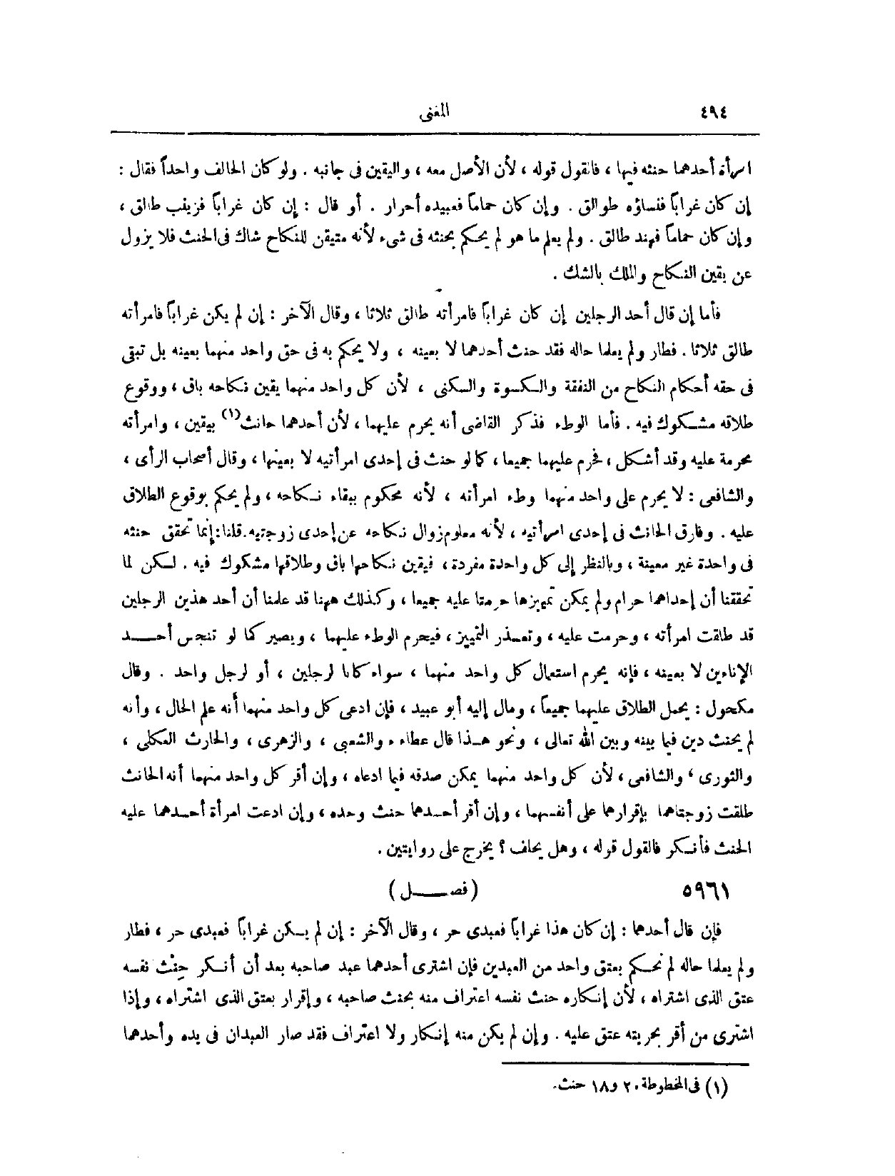 فَأَمَّا إنْ قَالَ أَحَدُ الرَّجُلَيْنِ: إنْ كَانَ غُرَابًا فَامْرَأَتُهُ طَالِقٌ ثَلَاثًا وَقَالَ الْآخَرُ: إنْ لَمْ يَكُنْ غُرَابًا فَامْرَأَتُهُ طَالِقٌ ثَلَاثًا فَطَارَ وَلَمْ يَعْلَمَا فَقَدْ حَنِثَ أَحَدُهُمَا لَا بِعَيْنِهِ وَلَا يُحْكَمُ بِهِ فِي حَقِّ وَاحِدٍ مِنْهُمَا بِعَيْنِهِ بَلْ تَبْقَى فِي حَقِّهِ أَحْكَامُ النِّكَاحِ مِنْ النَّفَقَةِ وَالْكُسْوَةِ وَالسُّكْنَى؛ لِأَنَّ كُلَّ وَاحِدٍ مِنْهُمَا يَقِينُ نِكَاحِهِ بَاقٍ وَوُقُوعُ طَلَاقِهِ مَشْكُوكٌ فِيهِ فَأَمَّا الْوَطْءُ فَذَكَرَ الْقَاضِي أَنَّهُ يَحْرُمُ عَلَيْهِمَا؛ لِأَنَّ أَحَدَهُمَا حَانِثٌ بِيَقِينٍ، وَامْرَأَتُهُ مُحَرَّمَةٌ عَلَيْهِ وَقَدْ أَشْكَلَ فَحَرُمَ عَلَيْهِمَا جَمِيعًا كَمَا لَوْ حَنِثَ فِي إحْدَى امْرَأَتَيْهِ لَا بِعَيْنِهَا وَقَالَ أَصْحَابُ الرَّأْيِ وَالشَّافِعِيُّ: لَا يَحْرُمُ عَلَى وَاحِدٍ مِنْهُمَا وَطْءُ امْرَأَتِهِ؛ لِأَنَّهُ مَحْكُومٌ بِبَقَاءِ نِكَاحِهِ وَلَمْ يُحْكَمْ بِوُقُوعِ الطَّلَاقِ عَلَيْهِ وَفَارَقَ الْحَانِثَ فِي إحْدَى امْرَأَتَيْهِ؛ لِأَنَّهُ مَعْلُومٌ زَوَالُ نِكَاحِهِ عَنْ إحْدَى زَوْجَتَيْهِ قُلْنَا: إنَّمَا تَحَقَّقَ حِنْثُهُ فِي وَاحِدَةٍ غَيْرِ مُعَيَّنَةٍ وَبِالنَّظَرِ إلَى كُلِّ وَاحِدَةٍ مُفْرَدَةٍ فَيَقِينُ نِكَاحِهَا بَاقٍ وَطَلَاقُهَا مَشْكُوكٌ فِيهِ لَكِنْ لَمَّا تَحَقَّقْنَا أَنَّ إحْدَاهُمَا حَرَامٌ وَلَمْ يُمْكِنْ تَمْيِيزُهَا حَرُمَتَا عَلَيْهِ جَمِيعًا