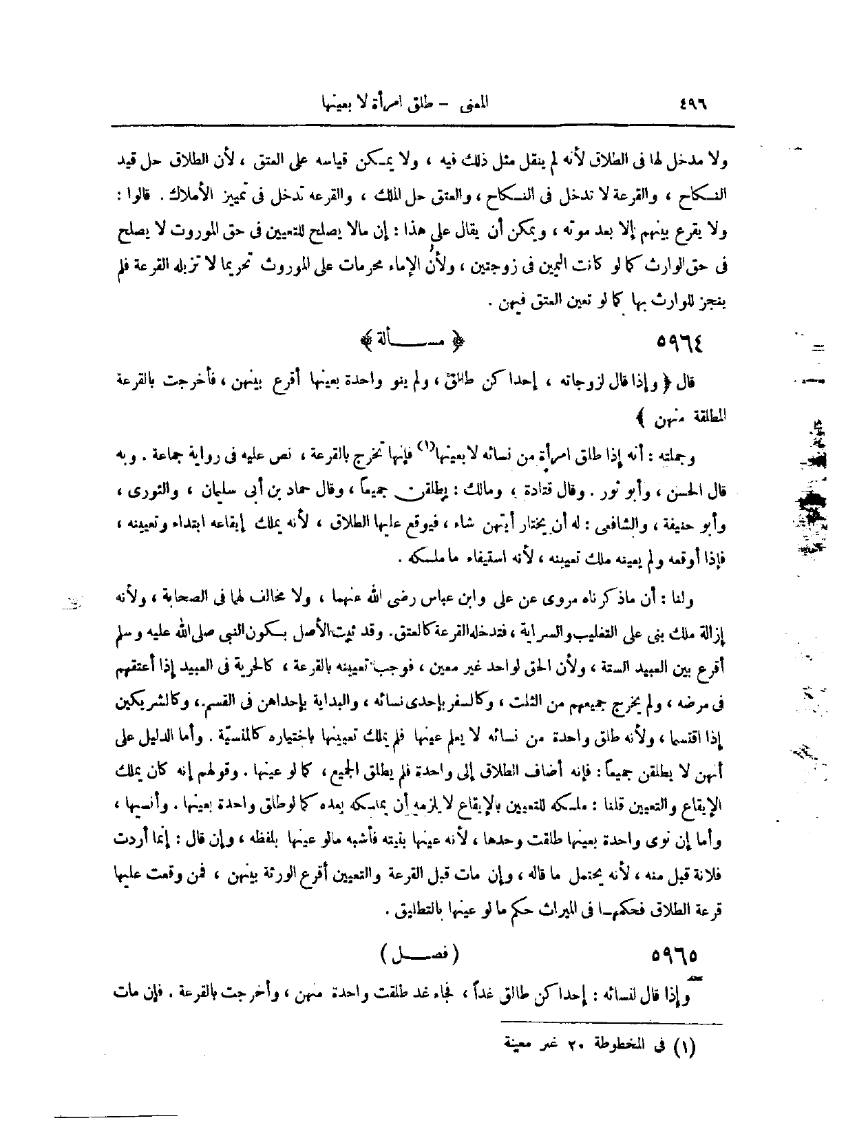 (٦٠٤٢) مَسْأَلَةٌ؛ قَالَ: (وَإِذَا قَالَ لِزَوْجَاتِهِ: إحْدَاكُنَّ طَالِقٌ وَلَمْ يَنْوِ وَاحِدَةً بِعَيْنِهَا أَقْرَعَ بَيْنَهُنَّ فَأُخْرِجَتْ بِالْقُرْعَةِ الْمُطَلَّقَةُ مِنْهُنَّ) وَجُمْلَتُهُ أَنَّهُ إذَا طَلَّقَ امْرَأَةً مِنْ نِسَائِهِ لَا بِعَيْنِهَا فَإِنَّهَا تَخْرُجُ بِالْقُرْعَةِ نَصَّ عَلَيْهِ فِي رِوَايَةِ جَمَاعَةٍ وَبِهِ قَالَ الْحَسَنُ وَأَبُو ثَوْرٍ وَقَالَ قَتَادَةُ وَمَالِكٌ: يَطْلُقْنَ جَمِيعًا وَقَالَ حَمَّادُ بْنُ أَبِي سُلَيْمَانَ وَالثَّوْرِيُّ وَأَبُو حَنِيفَةَ وَالشَّافِعِيُّ: لَهُ أَنْ يَخْتَارَ أَيَّتَهُنَّ شَاءَ فَيُوقِعَ عَلَيْهَا الطَّلَاقَ؛ لِأَنَّهُ يَمْلِكُ إيقَاعَهُ ابْتِدَاءً وَتَعْيِينَهُ، فَإِذَا أَوْقَعَهُ وَلَمْ يُعَيِّنْهُ مَلَكَ تَعْيِينَهُ؛ لِأَنَّهُ اسْتِيفَاءُ مَا مَلَكَهُ