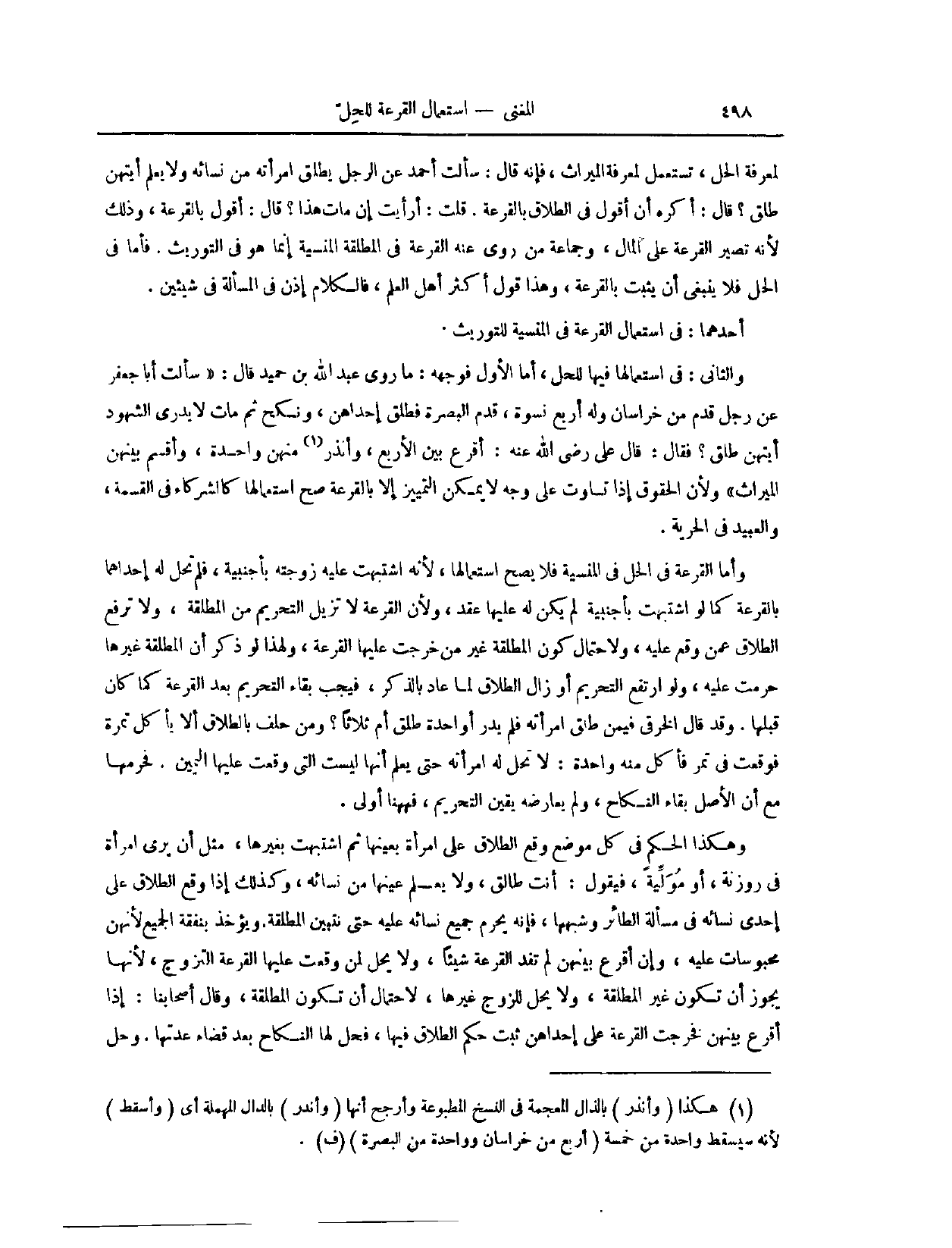 لِمَعْرِفَةِ الْحِلِّ وَإِنَّمَا تُسْتَعْمَلُ لِمَعْرِفَةِ الْمِيرَاثِ، فَإِنَّهُ قَالَ: سَأَلْت أَحْمَدَ عَنْ الرَّجُلِ يُطَلِّقُ امْرَأَةً مِنْ نِسَائِهِ وَلَا يَعْلَمُ أَيَّتَهُنَّ طَلَّقَ؟ قَالَ: أَكْرَهُ أَنْ أَقُولَ فِي الطَّلَاقِ بِالْقُرْعَةِ قُلْت: أَرَأَيْت إنْ مَاتَ هَذَا؟ قَالَ: أَقُولُ بِالْقُرْعَةِ، وَذَلِكَ لِأَنَّهُ تَصِيرُ الْقُرْعَةُ عَلَى الْمَالِ وَجَمَاعَةُ مَنْ رُوِيَ عَنْهُ الْقُرْعَةُ فِي الْمُطَلَّقَةِ الْمَنْسِيَّةِ إنَّمَا هُوَ فِي التَّوْرِيثِ فَأَمَّا فِي الْحِلِّ فَلَا يَنْبَغِي أَنْ يَثْبُتَ بِالْقُرْعَةِ