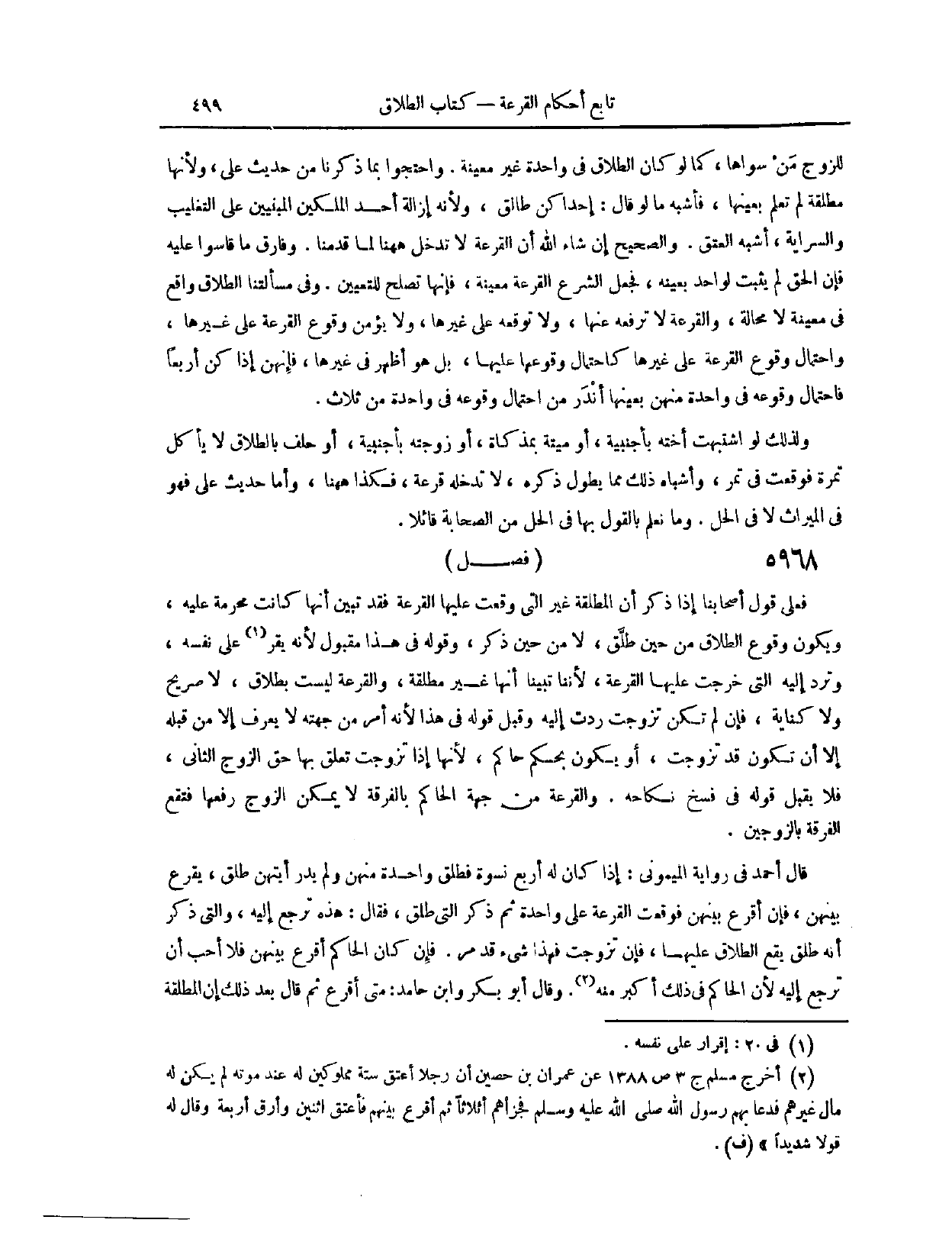 وَأَمَّا حَدِيثُ عَلِيٍّ فَهُوَ فِي الْمِيرَاثِ لَا فِي الْحِلِّ وَمَا نَعْلَمُ بِالْقَوْلِ بِهَا فِي الْحِلِّ مِنْ الصَّحَابَةِ قَائِلًا (٦٠٤٦) فَصْلٌ: فَعَلَى قَوْلِ أَصْحَابِنَا إذَا ذَكَرَ أَنَّ الْمُطَلَّقَةَ غَيْرُ الَّتِي وَقَعَتْ عَلَيْهَا الْقُرْعَةُ فَقَدْ تَبَيَّنَ أَنَّهَا كَانَتْ مُحَرَّمَةً عَلَيْهِ وَيَكُونُ وُقُوعُ الطَّلَاقِ مِنْ حِينِ طَلَّقَ لَا مِنْ حِينِ ذَكَرَ، وَقَوْلُهُ فِي هَذَا مَقْبُولٌ؛ لِأَنَّهُ يُقِرُّ عَلَى نَفْسِهِ وَتُرَدُّ إلَيْهِ الَّتِي خَرَجَتْ عَلَيْهَا الْقُرْعَةُ؛ لِأَنَّنَا تَبَيَّنَّا أَنَّهَا غَيْرُ مُطَلَّقَةٍ، وَالْقُرْعَةُ لَيْسَتْ بِطَلَاقٍ لَا صَرِيحٍ وَلَا كِنَايَةٍ، فَإِنْ لَمْ تَكُنْ تَزَوَّجَتْ رُدَّتْ إلَيْهِ وَقُبِلَ قَوْلُهُ فِي هَذَا؛ لِأَنَّهُ أَمْرٌ مِنْ جِهَتِهِ لَا يُعْرَفُ إلَّا مِنْ قِبَلِهِ إلَّا أَنْ تَكُونَ قَدْ تَزَوَّجَتْ أَوْ يَكُونَ بِحُكْمِ حَاكِمٍ؛ لِأَنَّهَا إذَا تَزَوَّجَتْ تَعَلَّقَ بِهَا حَقُّ الزَّوْجِ الثَّانِي فَلَا يُقْبَلُ قَوْلُهُ فِي فَسْخِ نِكَاحِهِ، وَالْقُرْعَةُ مِنْ جِهَةِ الْحَاكِمِ بِالْفُرْقَةِ لَا يُمْكِنُ الزَّوْجَ رَفْعُهَا فَتَقَعَ الْفُرْقَةُ بِالزَّوْجَيْنِ