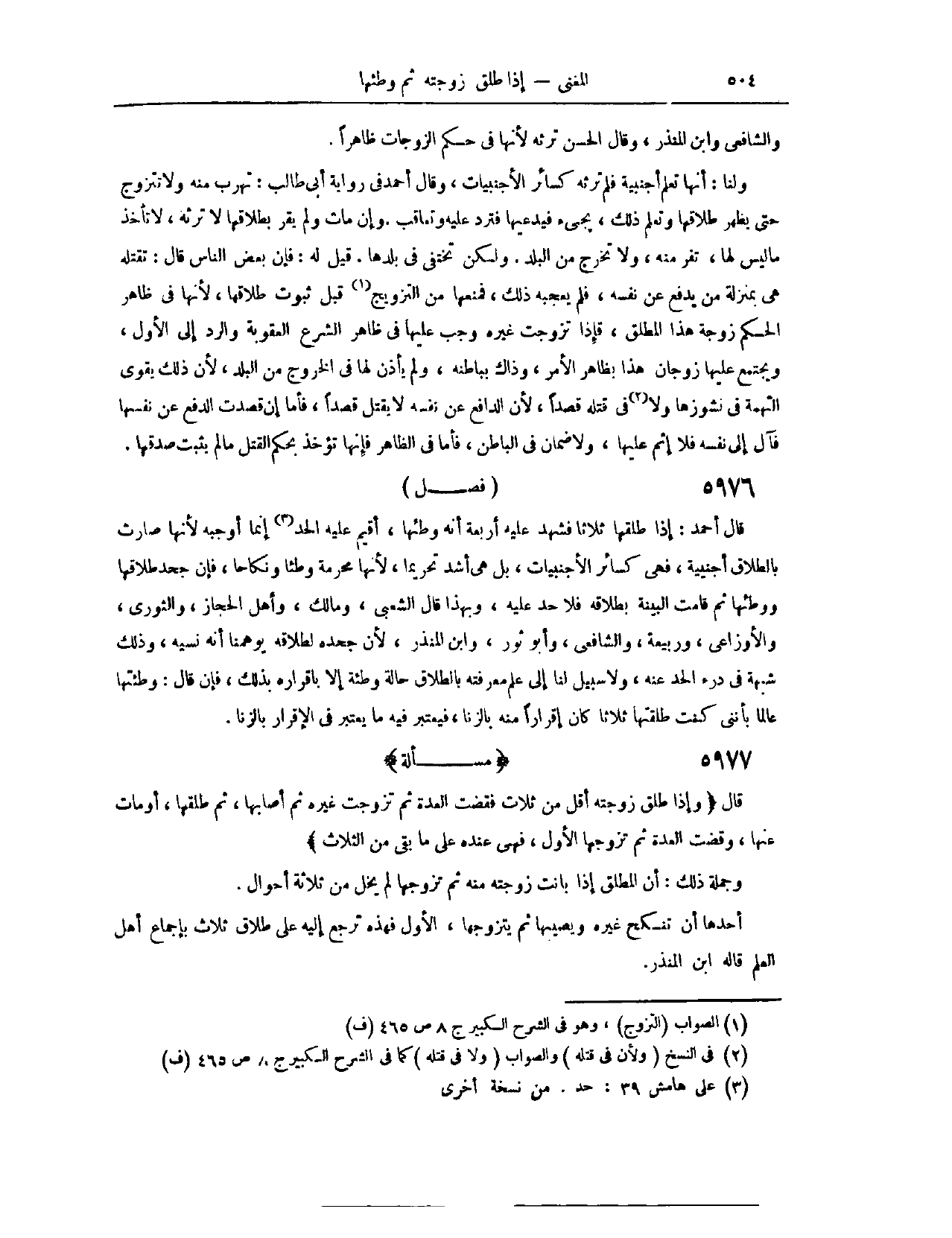 (٦٠٥٥) مَسْأَلَةٌ؛ قَالَ: (وَإِذَا طَلَّقَ زَوْجَتَهُ أَقَلَّ مِنْ ثَلَاثٍ فَقَضَتْ الْعِدَّةَ ثُمَّ تَزَوَّجَتْ غَيْرَهُ ثُمَّ أَصَابَهَا ثُمَّ طَلَّقَهَا أَوْ مَاتَ عَنْهَا وَقَضَتْ الْعِدَّةَ ثُمَّ تَزَوَّجَهَا الْأَوَّلُ فَهِيَ عِنْدَهُ عَلَى مَا بَقِيَ مِنْ الثَّلَاثِ) وَجُمْلَةُ ذَلِكَ أَنَّ الْمُطَلِّقَ إذَا بَانَتْ زَوْجَتُهُ مِنْهُ ثُمَّ تَزَوَّجَهَا لَمْ يَخْلُ مِنْ ثَلَاثَةِ أَحْوَالٍ؛ أَحَدُهَا أَنْ تَنْكِحَ غَيْرَهُ وَيُصِيبَهَا ثُمَّ يَتَزَوَّجَهَا الْأَوَّلُ فَهَذِهِ تَرْجِعُ إلَيْهِ عَلَى طَلَاقِ ثَلَاثٍ بِإِجْمَاعِ أَهْلِ الْعِلْمِ قَالَهُ ابْنُ الْمُنْذِرِ