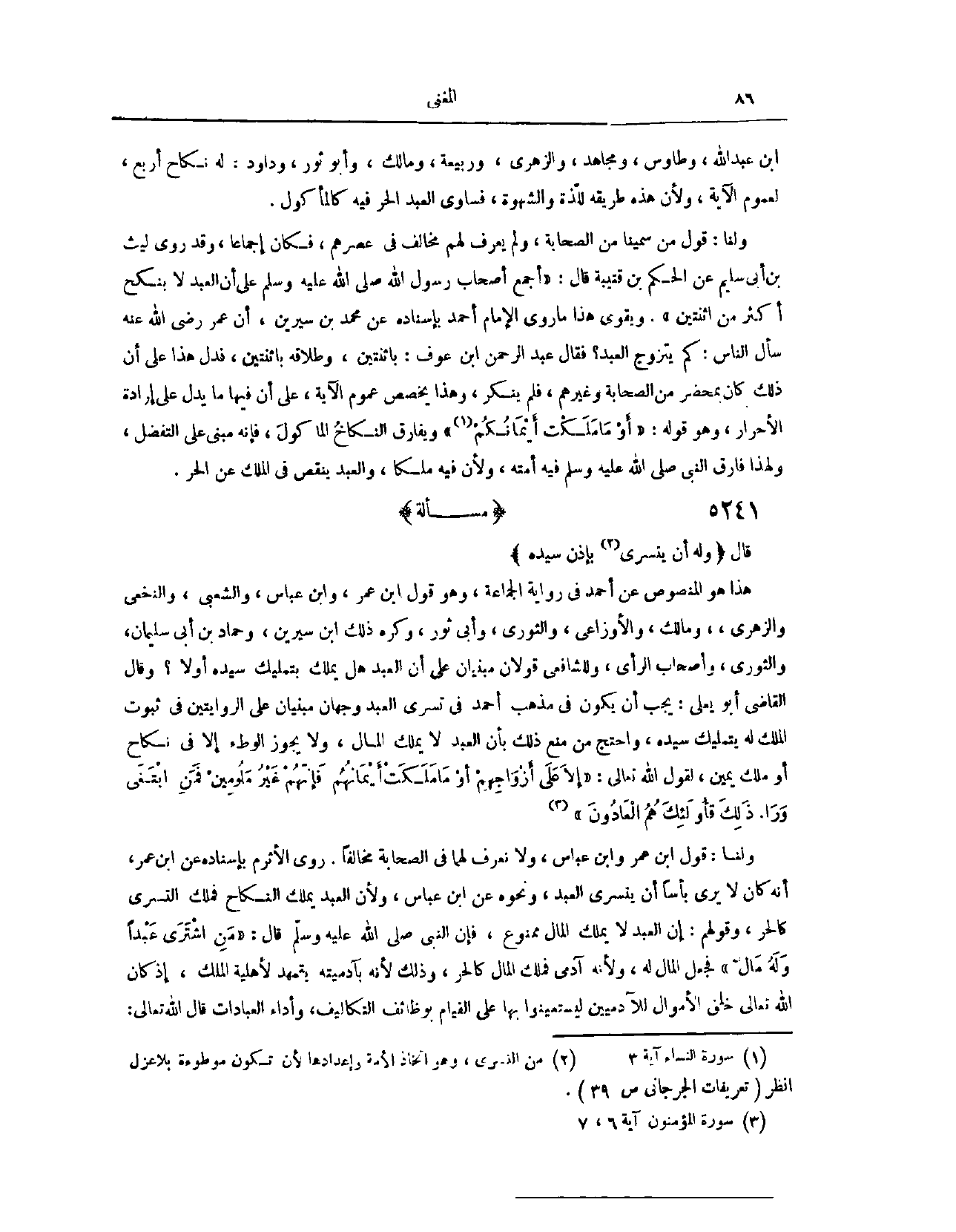 (٥٣٠٨) ؛ قَالَ: (وَلَهُ أَنْ يَتَسَرَّى بِإِذْنِ سَيِّدِهِ) هَذَا هُوَ الْمَنْصُوصُ عَنْ أَحْمَدَ فِي رِوَايَةِ الْجَمَاعَةِ. وَهُوَ قَوْلُ ابْنِ عُمَرَ، وَابْنِ عَبَّاسٍ، وَالشَّعْبِيِّ، وَالنَّخَعِيِّ، وَالزُّهْرِيِّ، وَمَالِكٍ، وَالْأَوْزَاعِيِّ، وَالثَّوْرِيِّ، وَأَبِي ثَوْرٍ. وَكَرِهَ ذَلِكَ ابْنُ سِيرِينَ، وَحَمَّادُ بْنُ أَبِي سُلَيْمَانَ، وَالثَّوْرِيُّ، وَأَصْحَابُ الرَّأْيِ.