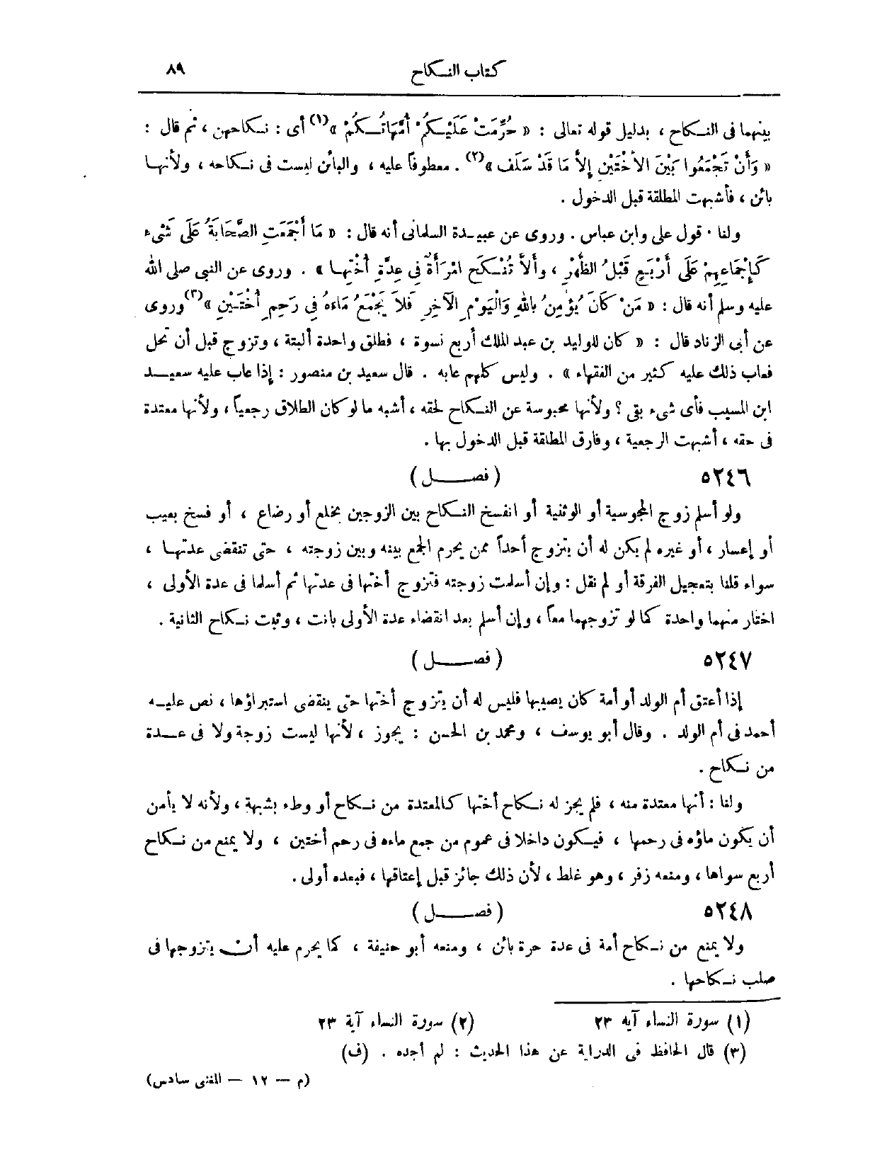 بَيْنَهُمَا فِي النِّكَاحِ، بِدَلِيلِ قَوْله تَعَالَى: {حُرِّمَتْ عَلَيْكُمْ أُمَّهَاتُكُمْ} [النساء: ٢٣] أَيْ: نِكَاحُهُنَّ، ثُمَّ قَالَ: {وَأَنْ تَجْمَعُوا بَيْنَ الأُخْتَيْنِ إِلا مَا قَدْ سَلَفَ} [النساء: ٢٣] مَعْطُوفًا عَلَيْهِ، وَالْبَائِنُ لَيْسَتْ فِي نِكَاحِهِ؛ وَلِأَنَّهَا بَائِنٌ فَأَشْبَهَتْ الْمُطَلَّقَةَ قَبْلَ الدُّخُولِ