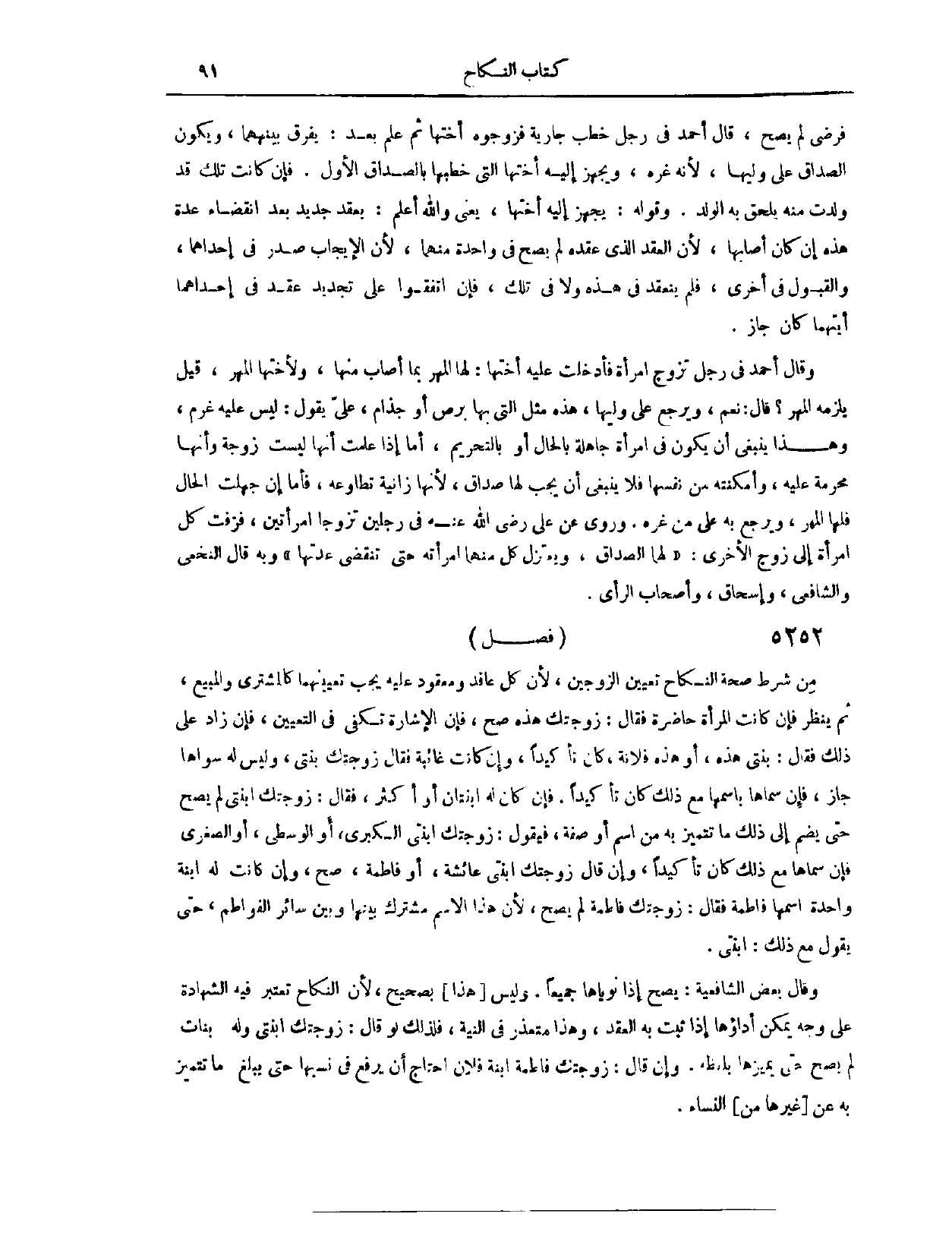 (٥٣١٩) فَصْلٌ: مِنْ شَرْطِ صِحَّةِ النِّكَاحِ تَعْيِينُ الزَّوْجَيْنِ؛ لِأَنَّ كُلَّ عَاقِدٍ وَمَعْقُودٍ عَلَيْهِ يَجِبُ تَعْيِينُهُمَا، كَالْمُشْتَرِي وَالْمَبِيعِ، ثُمَّ يُنْظَرُ، فَإِنْ كَانَتْ الْمَرْأَةُ حَاضِرَةً، فَقَالَ: زَوَّجْتُك هَذِهِ صَحَّ، فَإِنَّ الْإِشَارَةَ تَكْفِي فِي التَّعْيِينِ، فَإِنْ زَادَ عَلَى ذَلِكَ، فَقَالَ: بِنْتِي هَذِهِ، أَوْ هَذِهِ فُلَانَةُ كَانَ تَأْكِيدًا، وَإِنْ كَانَتْ غَائِبَةً فَقَالَ: زَوَّجْتُك بِنْتِي وَلَيْسَ لَهُ سِوَاهَا جَازَ. فَإِنْ سَمَّاهَا بِاسْمِهَا مَعَ ذَلِكَ، كَانَ تَأْكِيدًا. فَإِنْ كَانَ لَهُ ابْنَتَانِ أَوْ أَكْثَرُ، فَقَالَ: زَوَّجْتُك ابْنَتِي لَمْ يَصِحَّ حَتَّى يَضُمَّ إلَى ذَلِكَ مَا تَتَمَيَّزُ بِهِ، مِنْ اسْمٍ أَوْ صِفَةٍ، فَيَقُولَ: زَوَّجْتُك ابْنَتِي الْكُبْرَى أَوْ الْوُسْطَى أَوْ الصُّغْرَى فَإِنْ سَمَّاهَا مَعَ ذَلِكَ كَانَ تَأْكِيدًا