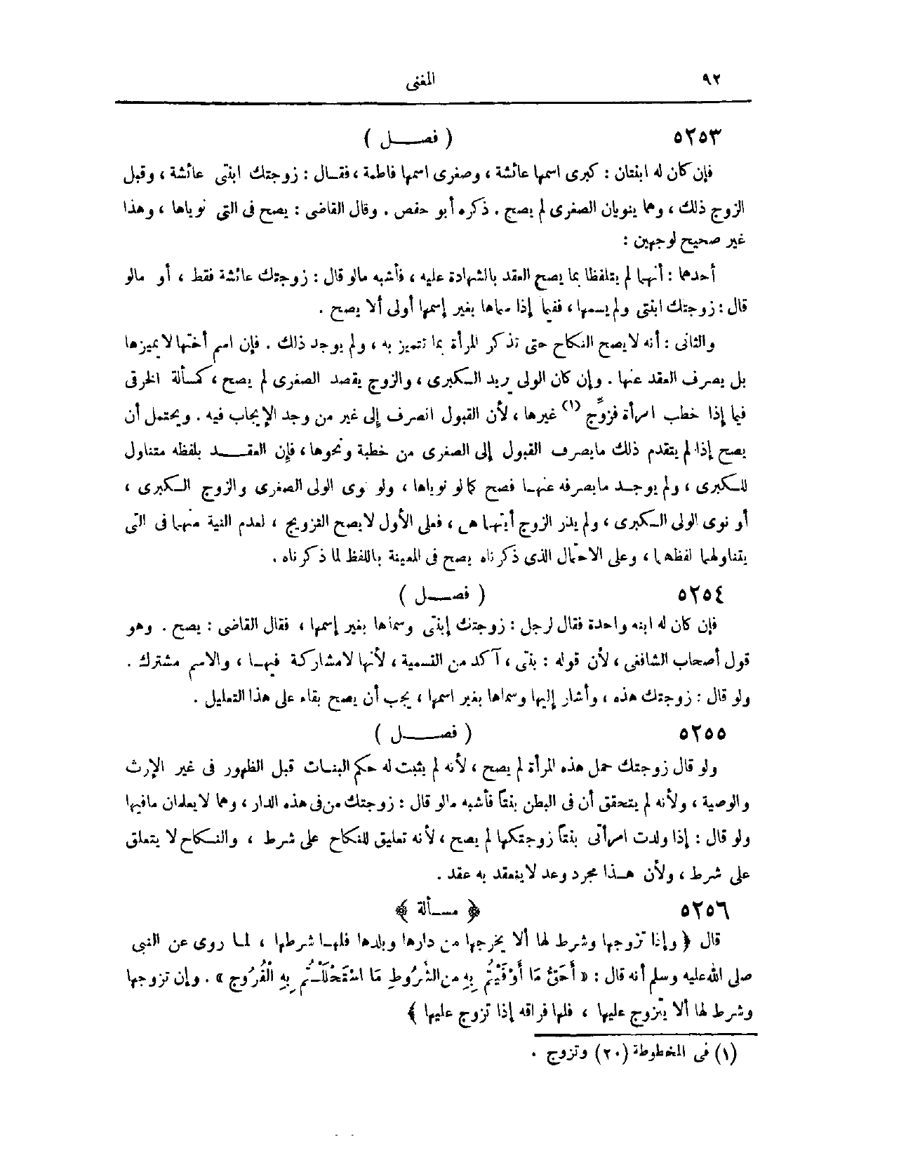 (٥٣٢٠) فَصْلٌ: فَإِنْ كَانَ لَهُ ابْنَتَانِ، كُبْرَى اسْمُهَا عَائِشَةُ وَصُغْرَى اسْمُهَا فَاطِمَةُ فَقَالَ: زَوَّجْتُك ابْنَتِي عَائِشَةَ وَقَبِلَ الزَّوْجُ ذَلِكَ، وَهُمَا يَنْوِيَانِ الصُّغْرَى، لَمْ يَصِحَّ. ذَكَرَهُ أَبُو حَفْصٍ وَقَالَ الْقَاضِي: يَصِحُّ فِي الَّتِي نَوَيَاهَا، وَهَذَا غَيْرُ صَحِيحٍ، لِوَجْهَيْنِ: أَحَدُهُمَا: أَنَّهُمَا لَمْ يَتَلَفَّظَا بِمَا يَصِحُّ الْعَقْدُ بِالشَّهَادَةِ عَلَيْهِ، فَأَشْبَهَ مَا لَوْ قَالَ: زَوَّجْتُك عَائِشَةَ فَقَطْ أَوْ مَا لَوْ قَالَ: زَوَّجْتُك ابْنَتِي وَلَمْ يُسَمِّهَا، وَإِذَا لَمْ يَصِحَّ فِيمَا إذَا لَمْ يُسَمِّهَا، فَفِيمَا إذَا سَمَّاهَا بِغَيْرِ اسْمِهَا أَوْلَى أَنْ لَا يَصِحَّ وَالثَّانِي: أَنَّهُ لَا يَصِحُّ النِّكَاحُ حَتَّى تُذْكَرَ الْمَرْأَةُ بِمَا تَتَمَيَّزُ بِهِ وَلَمْ يُوجَدْ ذَلِكَ، فَإِنَّ اسْمَ أُخْتِهَا لَا يُمَيِّزُهَا، بَلْ يَصْرِفُ الْعَقْدَ عَنْهَا.
