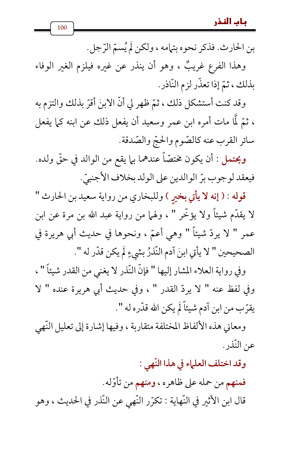 قال ابن الأثير في النّهاية: تكرّر النّهي عن النّذر في الحديث، وهو