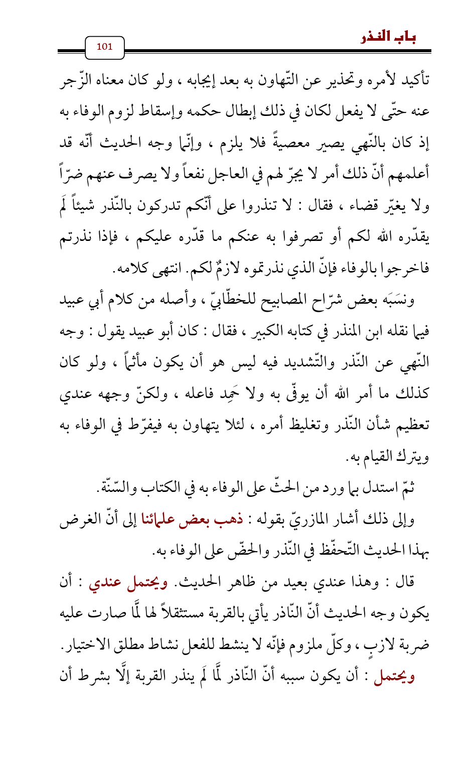 قال: وهذا عندي بعيد من ظاهر الحديث. ويحتمل عندي: أن يكون وجه الحديث أنّ النّاذر يأتي بالقربة مستثقلاً لها لَمَّا صارت عليه ضربة لازبٍ، وكلّ ملزوم فإنّه لا ينشط للفعل نشاط مطلق الاختيار.