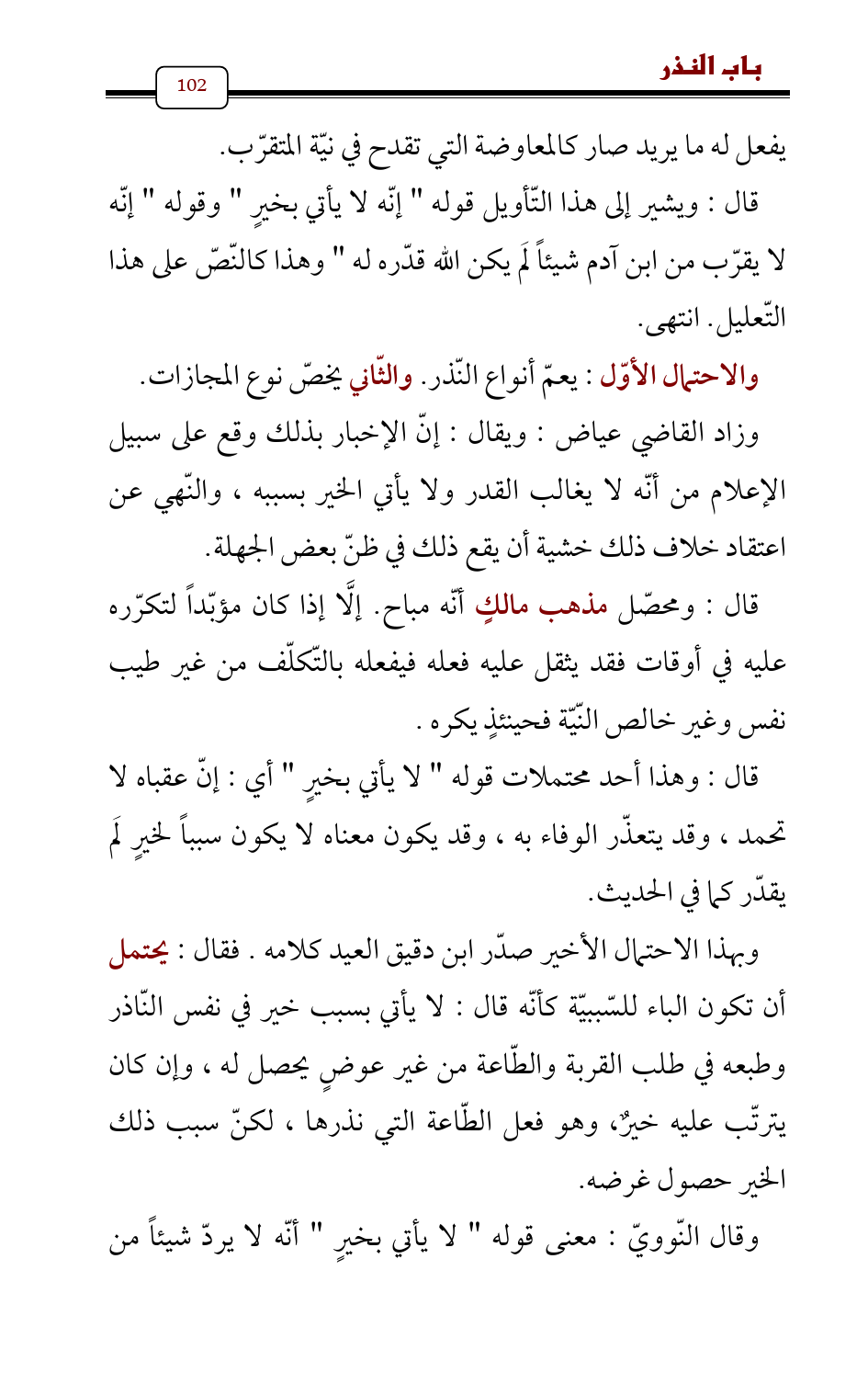 قال: وهذا أحد محتملات قوله " لا يأتي بخيرٍ " أي: إنّ عقباه لا تحمد , وقد يتعذّر الوفاء به، وقد يكون معناه لا يكون سبباً لخيرٍ لَم يقدّر كما في الحديث.