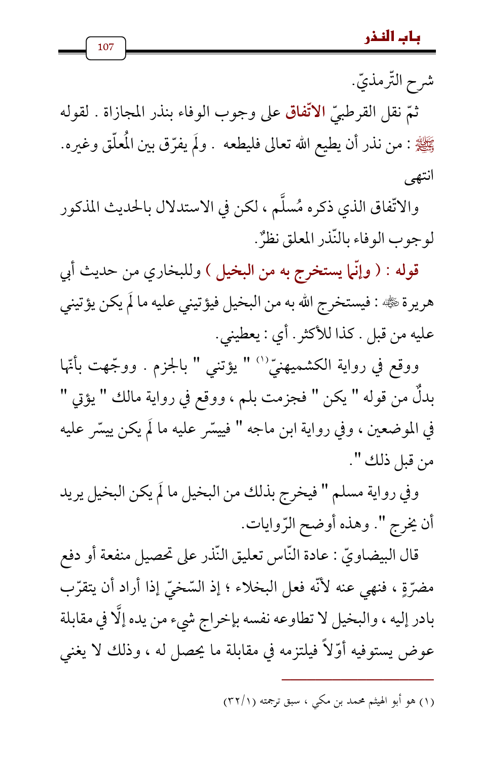 والاتّفاق الذي ذكره مُسلَّم، لكن في الاستدلال بالحديث المذكور لوجوب الوفاء بالنّذر المعلق نظرٌ.