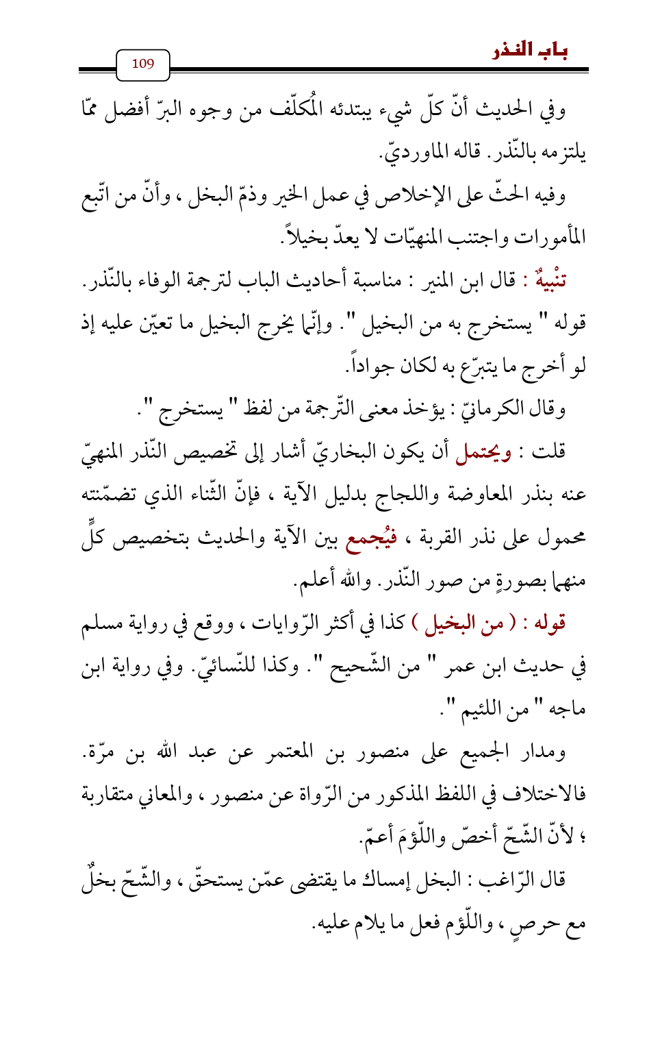 تنْبيهٌ: قال ابن المنير: مناسبة أحاديث الباب لترجمة الوفاء بالنّذر. قوله " يستخرج به من البخيل ". وإنّما يخرج البخيل ما تعيّن عليه إذ لو أخرج ما يتبرّع به لكان جواداً.