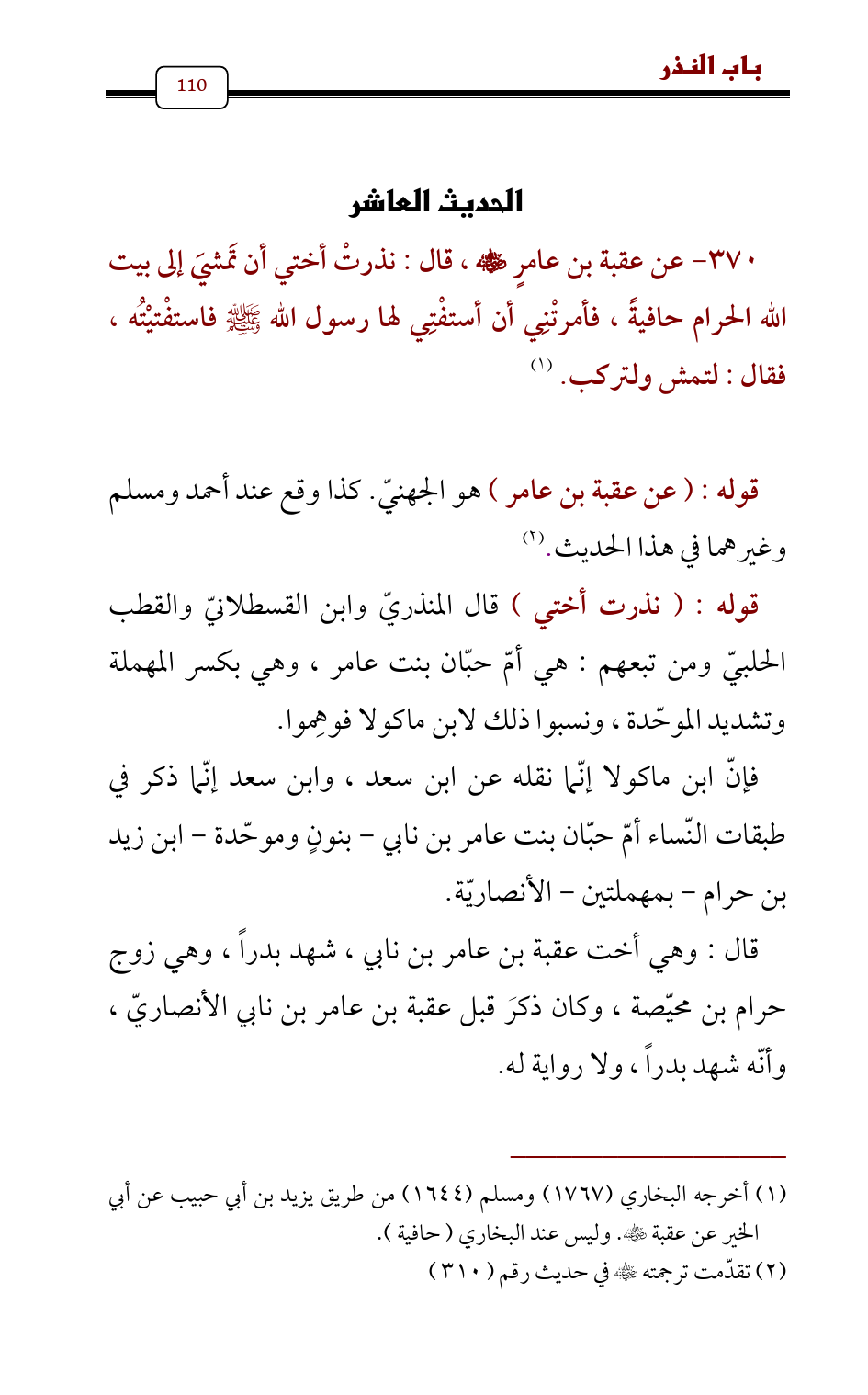 (¬1) أخرجه البخاري (1767) ومسلم (1644) من طريق يزيد بن أبي حبيب عن أبي الخير عن عقبة - رضي الله عنه -. وليس عند البخاري (حافية).