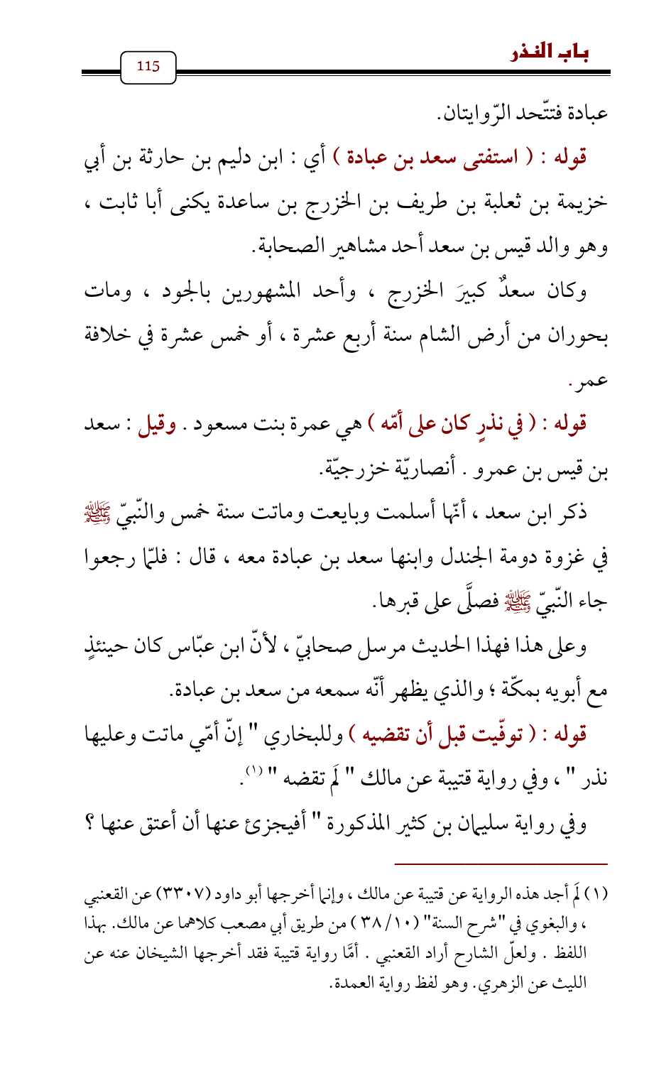 قوله: (في نذرٍ كان على أمّه) هي عمرة بنت مسعود. وقيل: سعد بن قيس بن عمرو. أنصاريّة خزرجيّة.