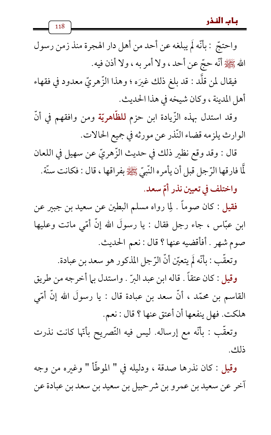 وقد استدل بهذه الزّيادة ابن حزم للظّاهريّة ومن وافقهم في أنّ الوارث يلزمه قضاء النّذر عن مورثه في جميع الحالات.