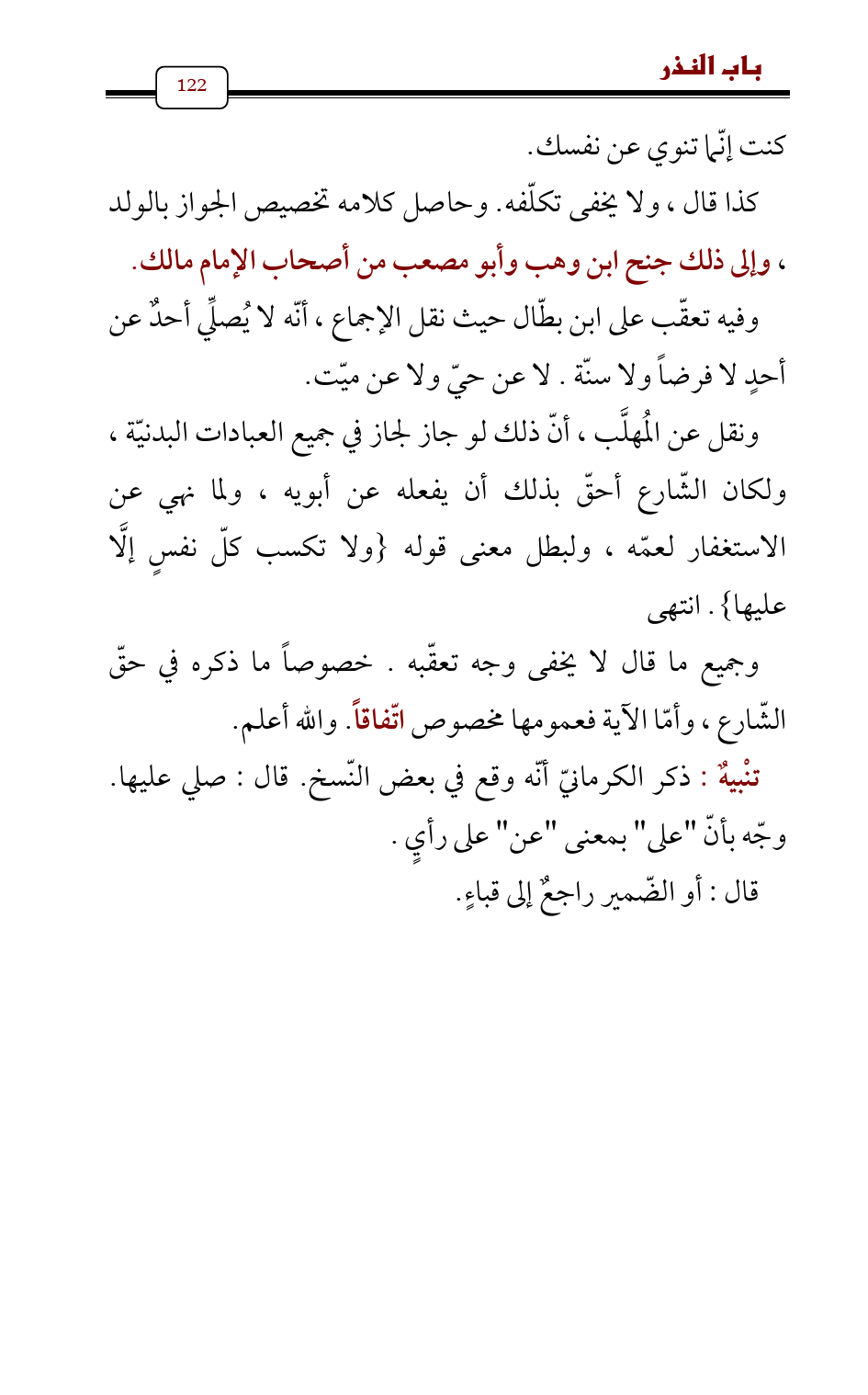 كذا قال , ولا يخفى تكلّفه. وحاصل كلامه تخصيص الجواز بالولد، وإلى ذلك جنح ابن وهب وأبو مصعب من أصحاب الإمام مالك.
