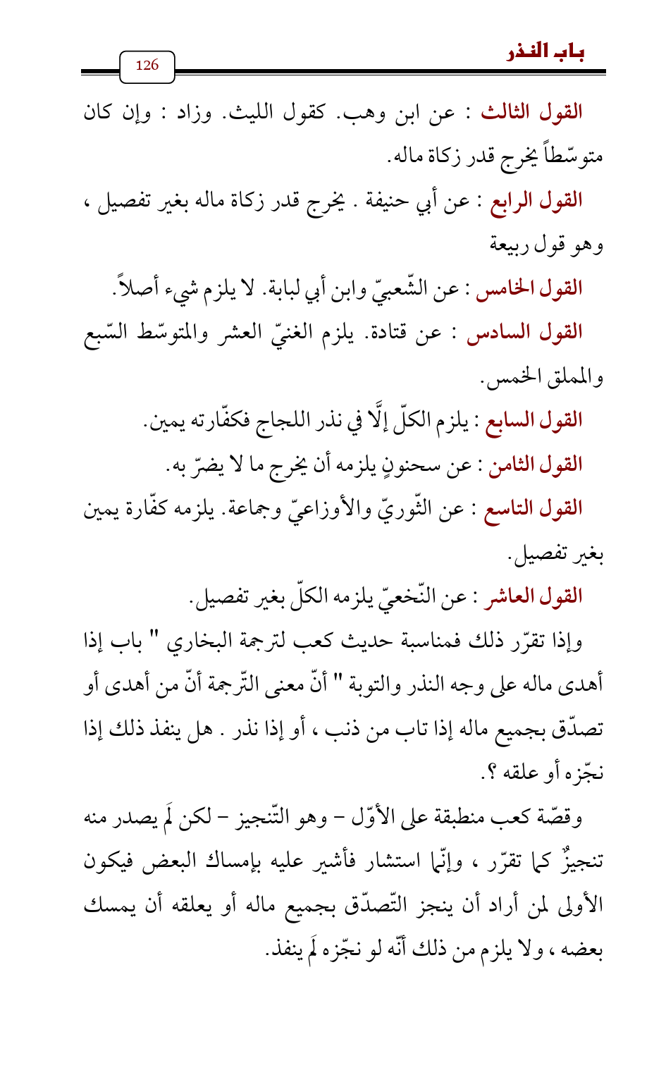 وقصّة كعب منطبقة على الأوّل - وهو التّنجيز - لكن لَم يصدر منه تنجيزٌ كما تقرّر، وإنّما استشار فأشير عليه بإمساك البعض فيكون الأولى لمن أراد أن ينجز التّصدّق بجميع ماله أو يعلقه أن يمسك بعضه، ولا يلزم من ذلك أنّه لو نجّزه لَم ينفذ.