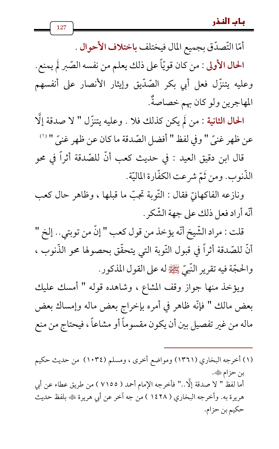 الحال الثانية: من لَم يكن كذلك فلا. وعليه يتنزّل " لا صدقة إلَّا عن ظهر غنىً " وفي لفظ " أفضل الصّدقة ما كان عن ظهر غنىً " (¬1)