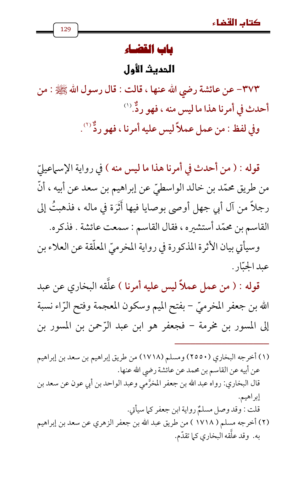 قوله: (من أحدث في أمرنا هذا ما ليس منه) في رواية الإسماعيليّ من طريق محمّد بن خالد الواسطيّ عن إبراهيم بن سعد عن أبيه , أنّ رجلاً من آل أبي جهل أوصى بوصايا فيها أَثَرَة في ماله، فذهبتُ إلى القاسم بن محمّد أستشيره , فقال القاسم: سمعت عائشة. فذكره.