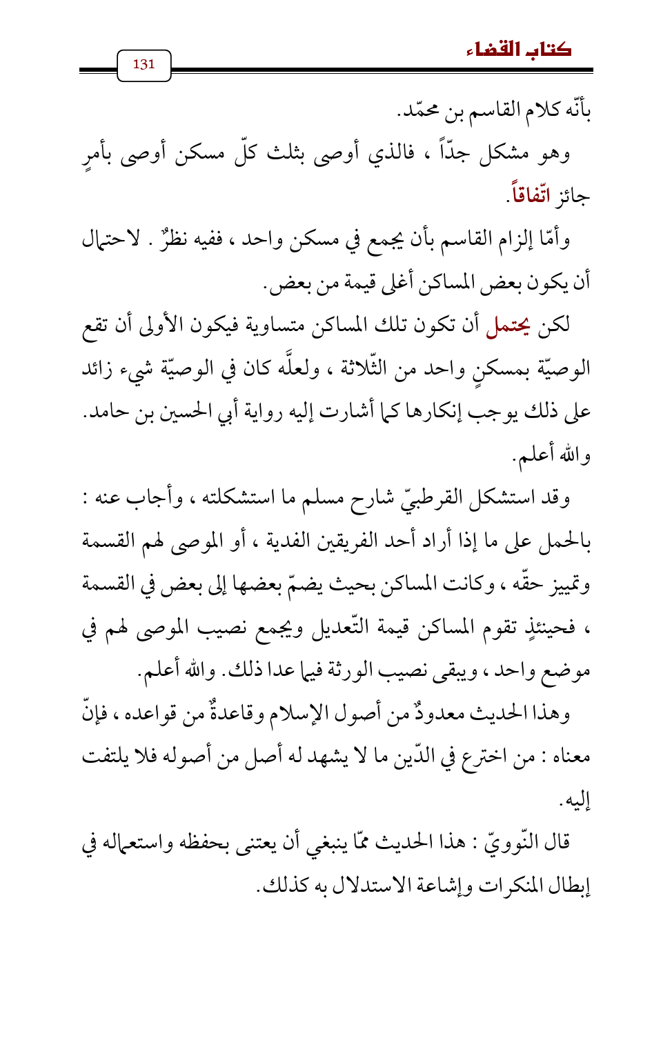 لكن يحتمل أن تكون تلك المساكن متساوية فيكون الأولى أن تقع الوصيّة بمسكنٍ واحد من الثّلاثة، ولعلَّه كان في الوصيّة شيء زائد على ذلك يوجب إنكارها كما أشارت إليه رواية أبي الحسين بن حامد. والله أعلم.