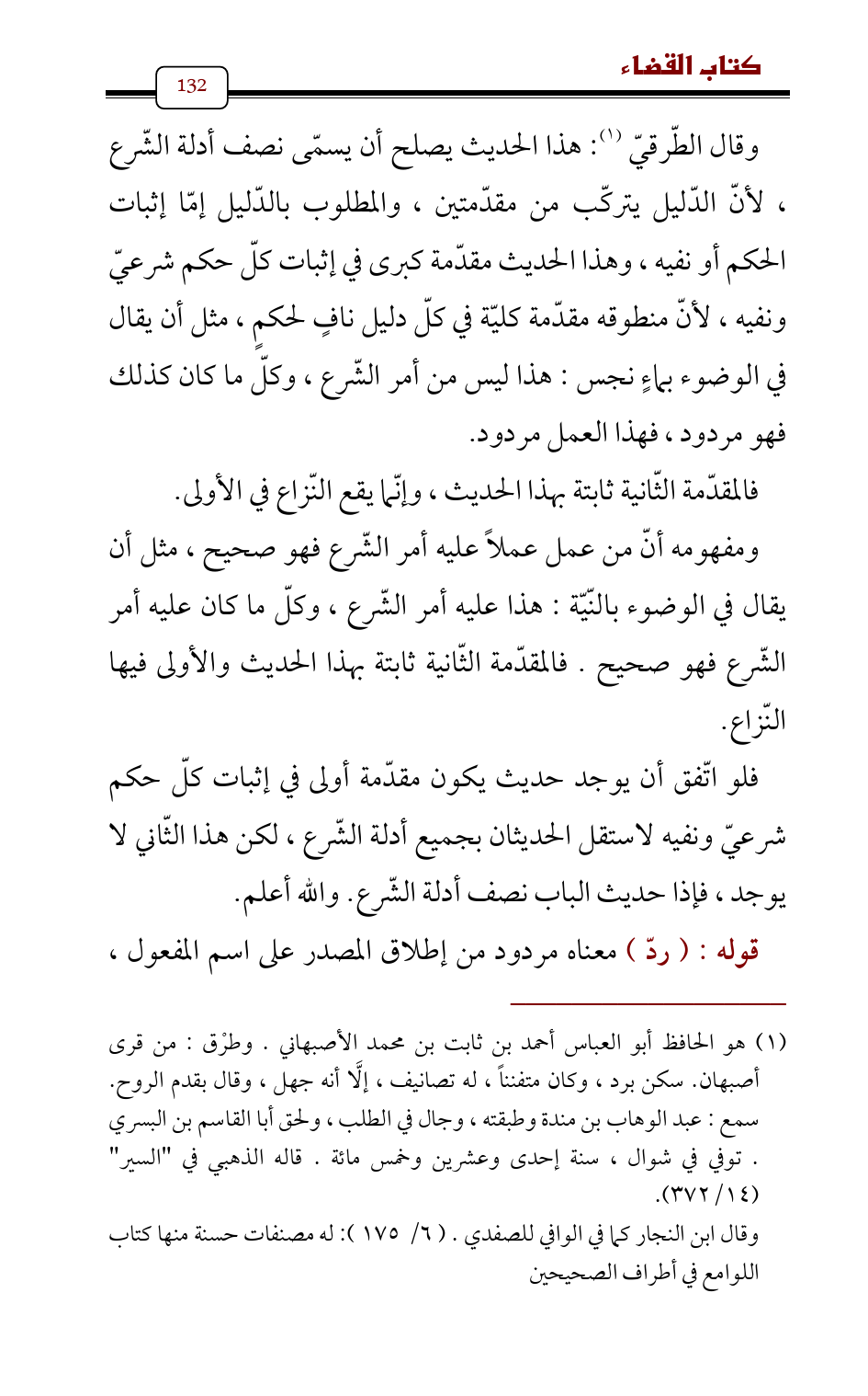 وقال الطّرقيّ (¬1): هذا الحديث يصلح أن يسمّى نصف أدلة الشّرع، لأنّ الدّليل يتركّب من مقدّمتين، والمطلوب بالدّليل إمّا إثبات الحكم أو نفيه، وهذا الحديث مقدّمة كبرى في إثبات كلّ حكم شرعيّ ونفيه، لأنّ منطوقه مقدّمة كليّة في كلّ دليل نافٍ لحكمٍ، مثل أن يقال في الوضوء بماءٍ نجس: هذا ليس من أمر الشّرع، وكلّ ما كان كذلك فهو مردود، فهذا العمل مردود.