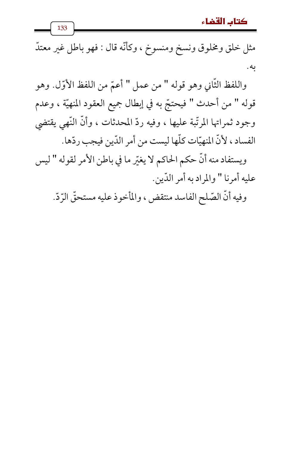 واللفظ الثّاني وهو قوله " من عمل " أعمّ من اللفظ الأوّل. وهو قوله " من أحدث " فيحتجّ به في إبطال جميع العقود المنهيّة , وعدم وجود ثمراتها المرتّبة عليها , وفيه ردّ المحدثات , وأنّ النّهي يقتضي الفساد، لأنّ المنهيّات كلّها ليست من أمر الدّين فيجب ردّها.