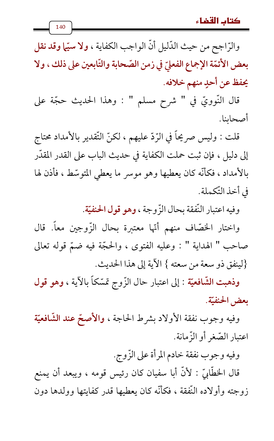 واختار الخصّاف منهم أنّها معتبرة بحال الزّوجين معاً. قال صاحب " الهداية ": وعليه الفتوى، والحجّة فيه ضمّ قوله تعالى {لينفق ذو سعة من سعته} الآية إلى هذا الحديث.