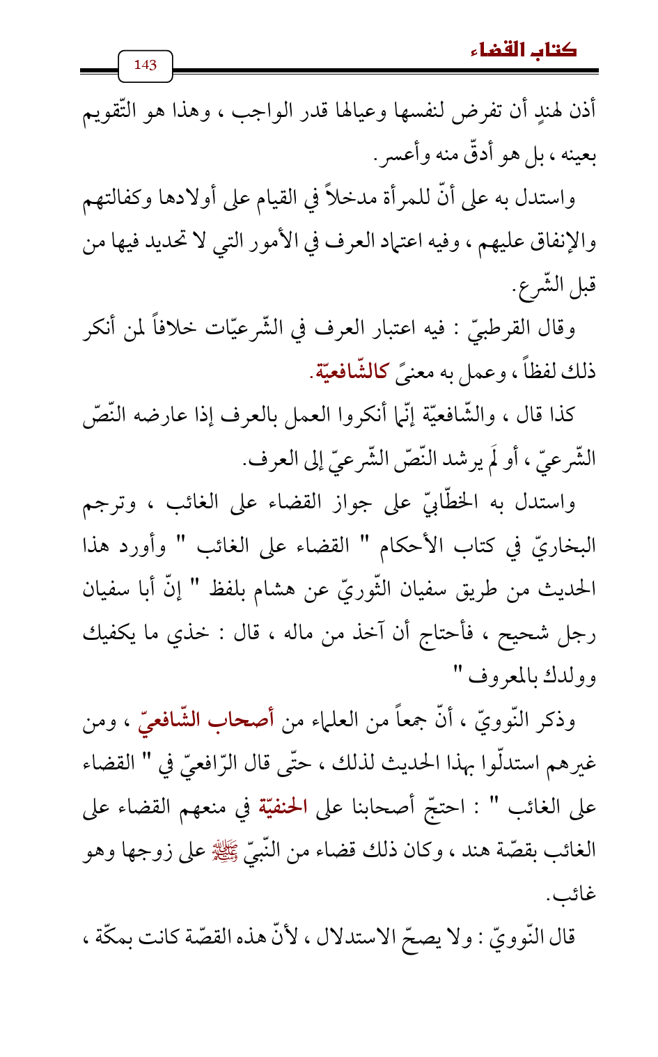 وذكر النّوويّ , أنّ جمعاً من العلماء من أصحاب الشّافعيّ , ومن غيرهم استدلّوا بهذا الحديث لذلك، حتّى قال الرّافعيّ في " القضاء على الغائب ": احتجّ أصحابنا على الحنفيّة في منعهم القضاء على الغائب بقصّة هند، وكان ذلك قضاء من النّبيّ - صلى الله عليه وسلم - على زوجها وهو غائب.