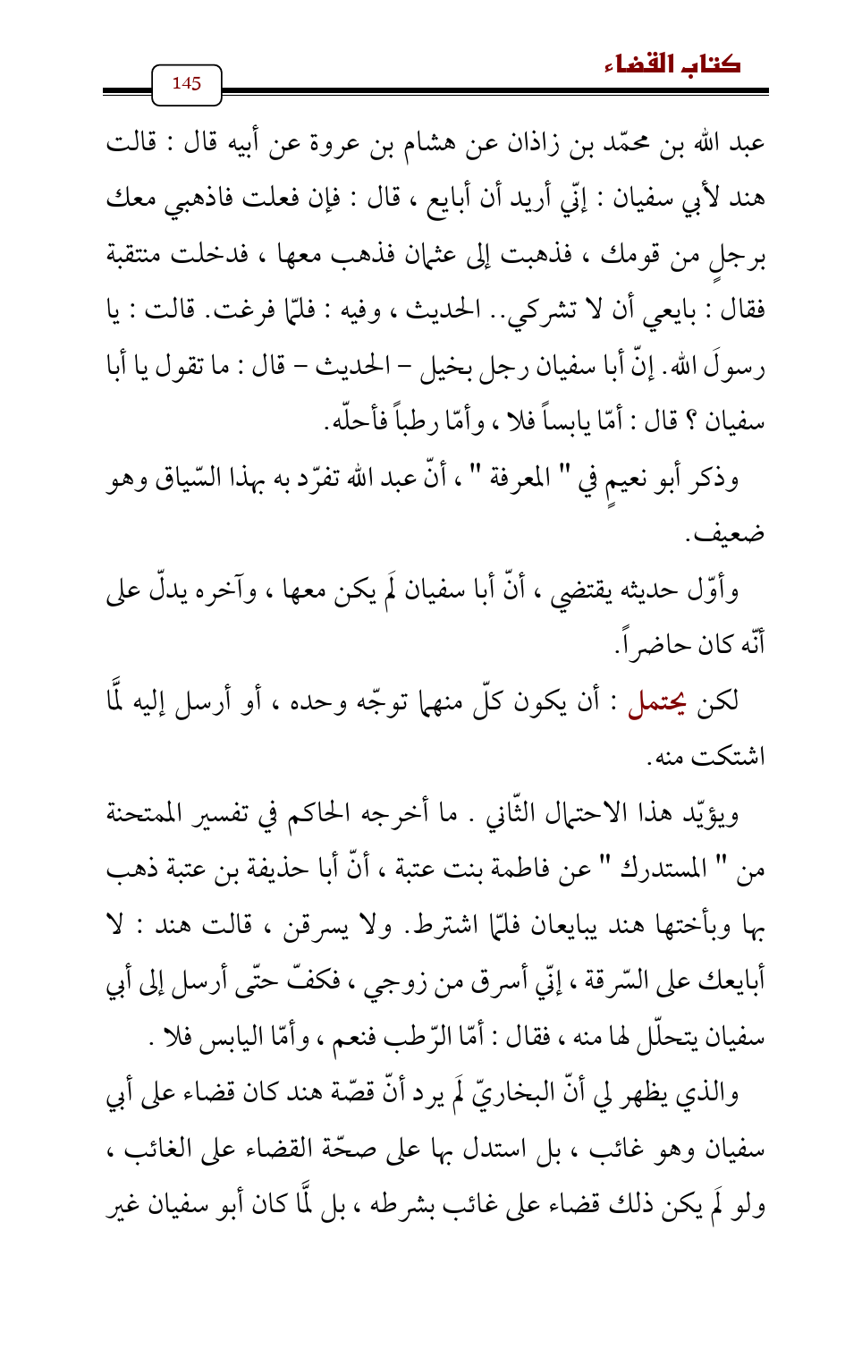 والذي يظهر لي أنّ البخاريّ لَم يرد أنّ قصّة هند كان قضاء على أبي سفيان وهو غائب، بل استدل بها على صحّة القضاء على الغائب , ولو لَم يكن ذلك قضاء على غائب بشرطه، بل لمَّا كان أبو سفيان غير