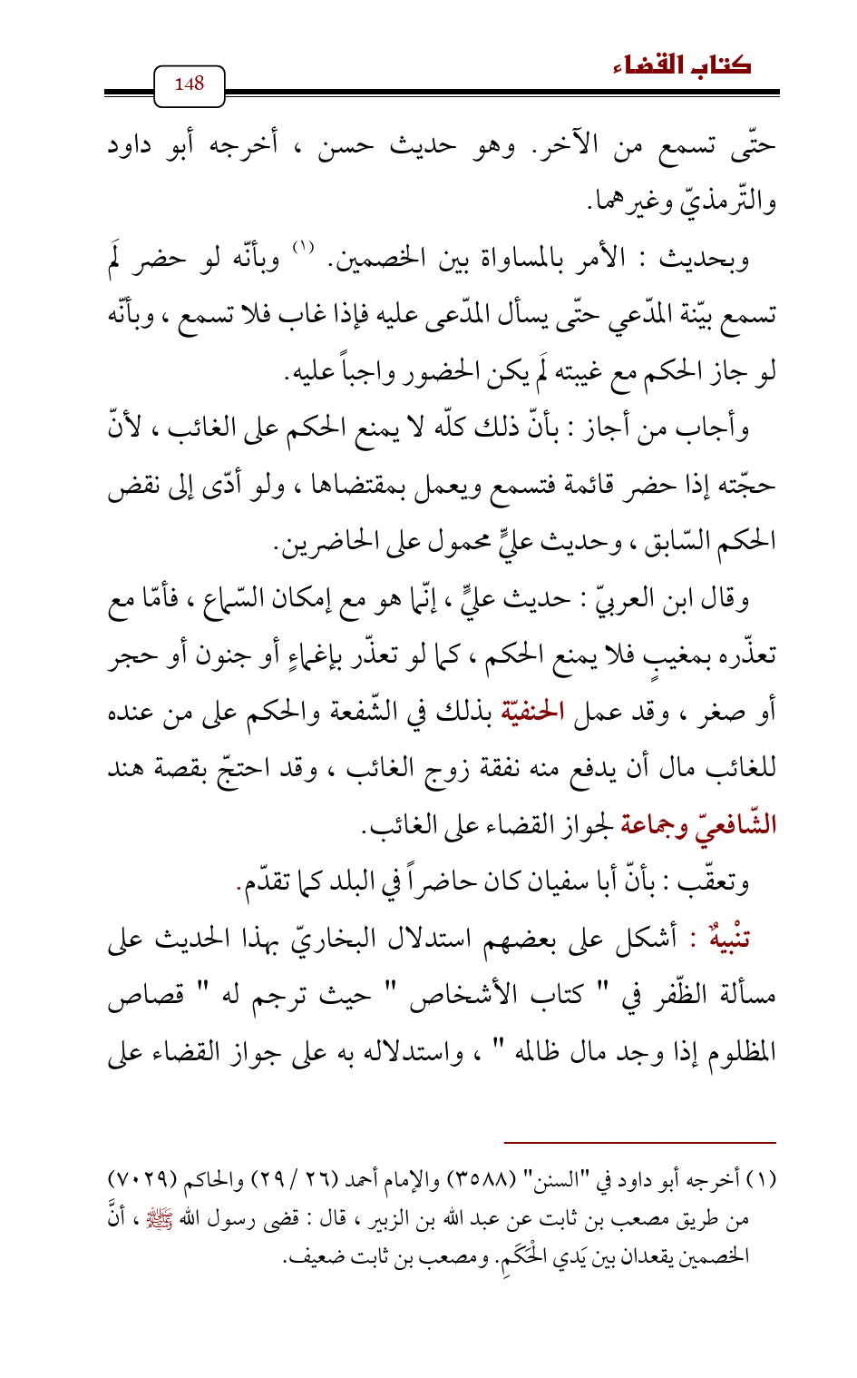 (¬1) أخرجه أبو داود في " السنن " (3588) والإمام أحمد (26/ 29) والحاكم (7029) من طريق مصعب بن ثابت عن عبد الله بن الزبير , قال: قضى رسول الله - صلى الله عليه وسلم - , أنَّ الخصمين يقعدان بين يَدي الْحَكَمِ. ومصعب بن ثابت ضعيف.