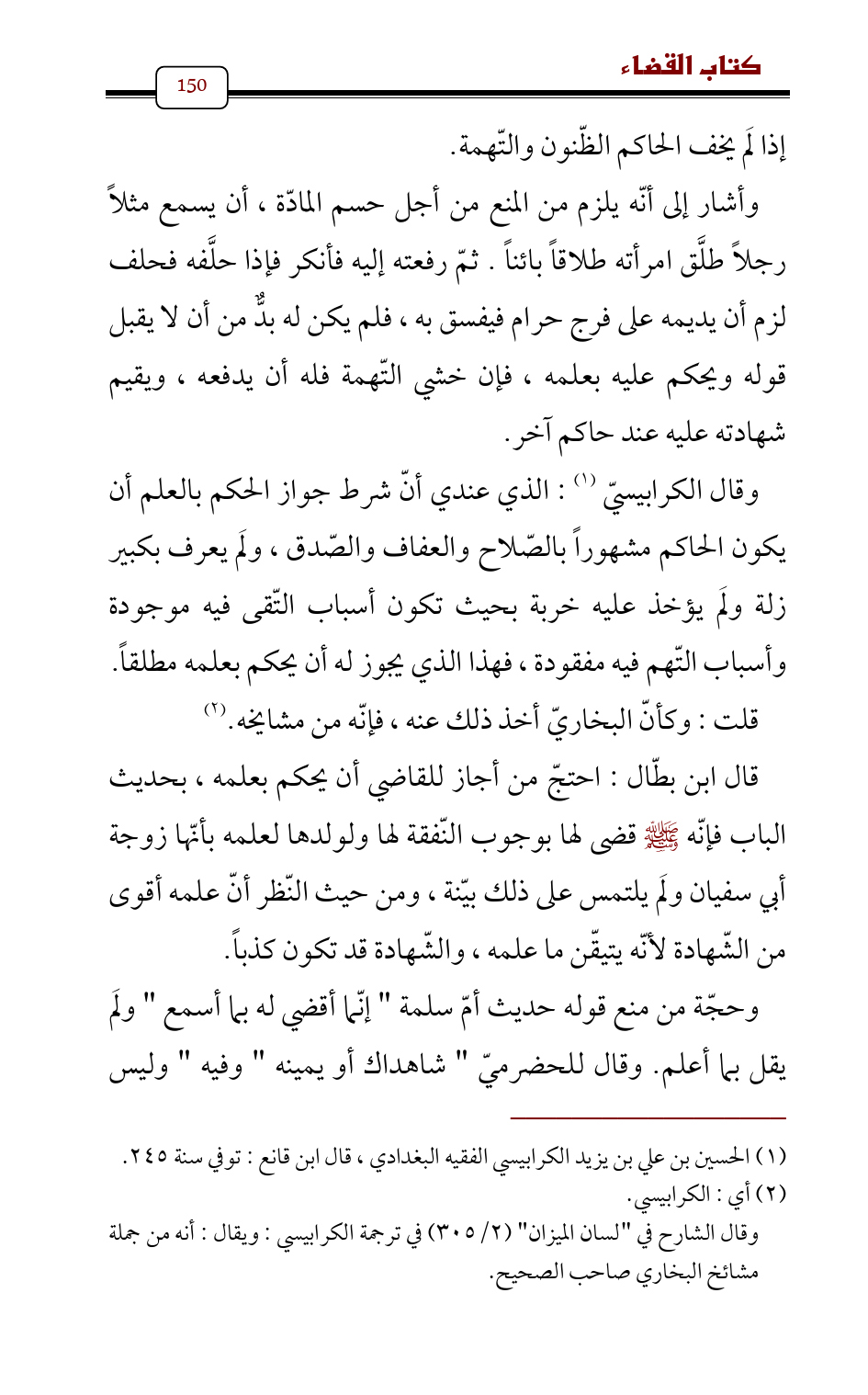 وقال الكرابيسيّ (¬1): الذي عندي أنّ شرط جواز الحكم بالعلم أن يكون الحاكم مشهوراً بالصّلاح والعفاف والصّدق , ولَم يعرف بكبير زلة ولَم يؤخذ عليه خربة بحيث تكون أسباب التّقى فيه موجودة وأسباب التّهم فيه مفقودة , فهذا الذي يجوز له أن يحكم بعلمه مطلقاً.