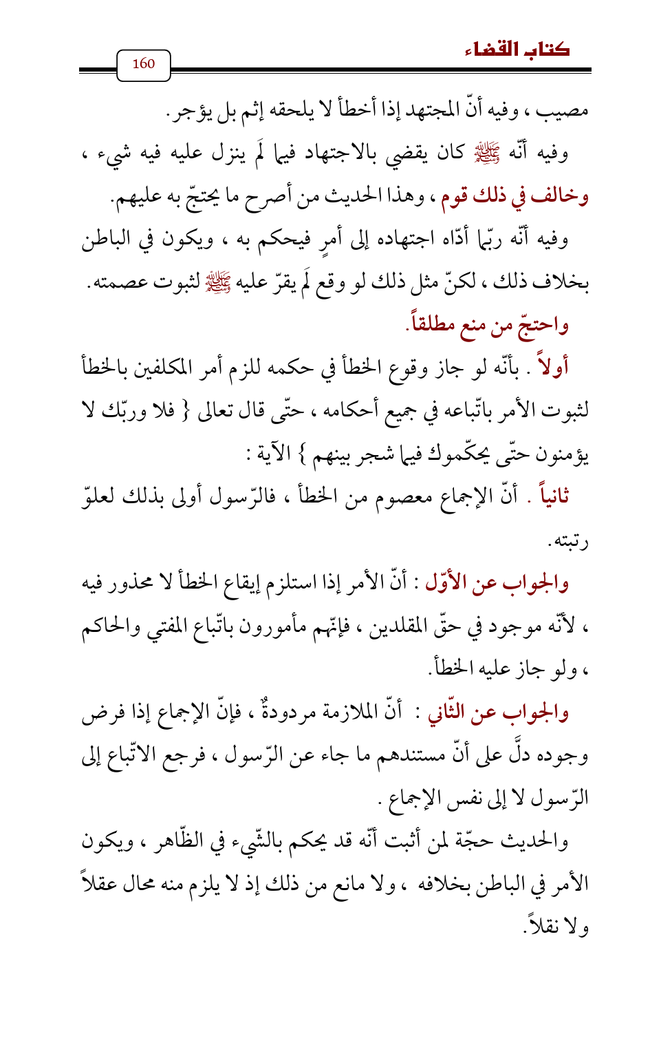 والجواب عن الأوّل: أنّ الأمر إذا استلزم إيقاع الخطأ لا محذور فيه، لأنّه موجود في حقّ المقلدين , فإنّهم مأمورون باتّباع المفتي والحاكم , ولو جاز عليه الخطأ.