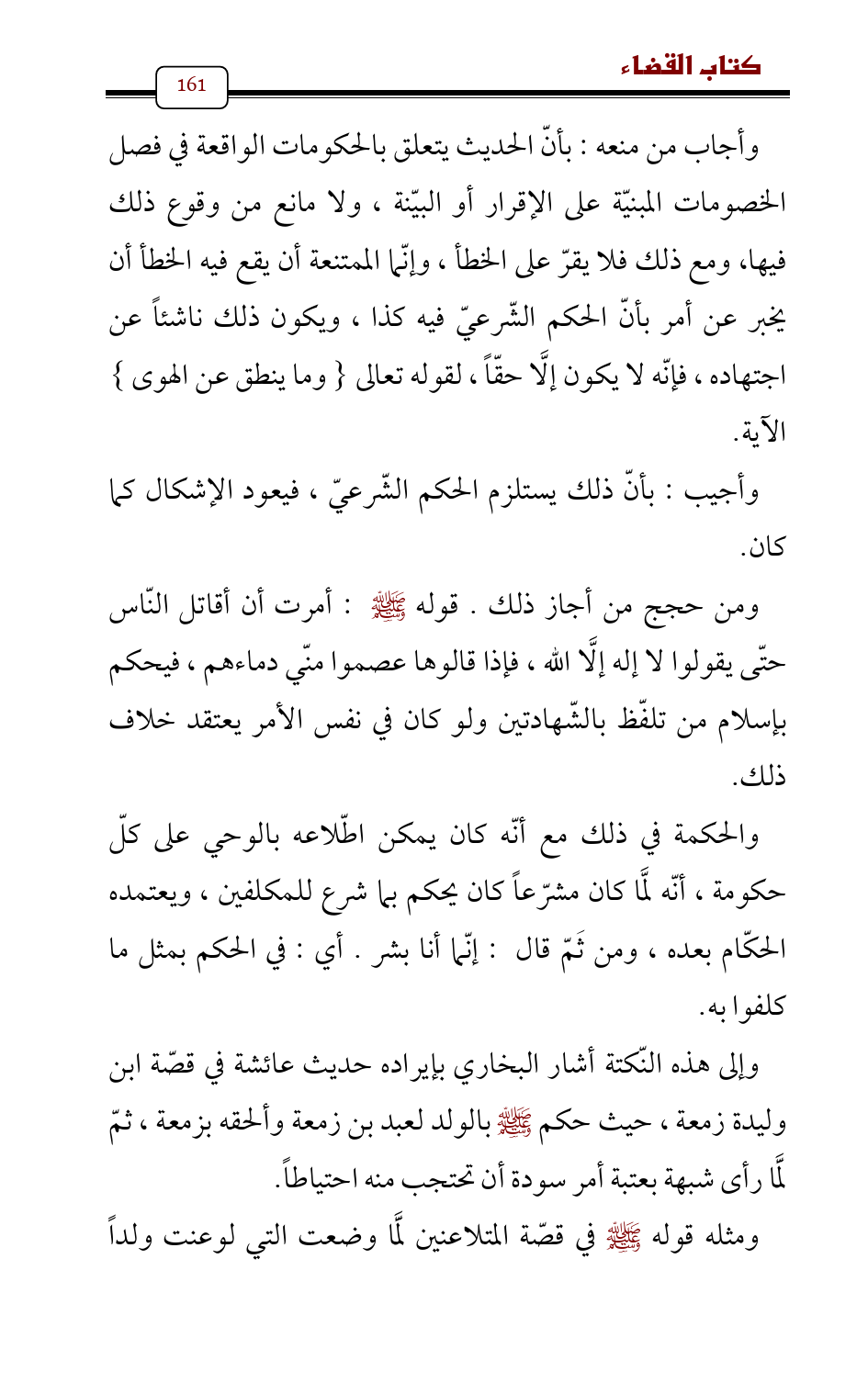 وأجاب من منعه: بأنّ الحديث يتعلق بالحكومات الواقعة في فصل الخصومات المبنيّة على الإقرار أو البيّنة، ولا مانع من وقوع ذلك فيها، ومع ذلك فلا يقرّ على الخطأ، وإنّما الممتنعة أن يقع فيه الخطأ أن يخبر عن أمر بأنّ الحكم الشّرعيّ فيه كذا , ويكون ذلك ناشئاً عن اجتهاده , فإنّه لا يكون إلَّا حقّاً، لقوله تعالى {وما ينطق عن الهوى} الآية.