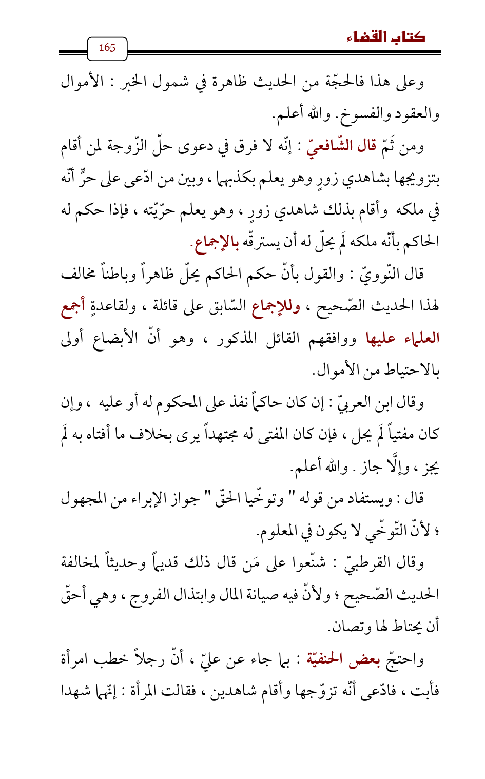 قال النّوويّ: والقول بأنّ حكم الحاكم يحلّ ظاهراً وباطناً مخالف لهذا الحديث الصّحيح، وللإجماع السّابق على قائلة , ولقاعدةٍ أجمع العلماء عليها ووافقهم القائل المذكور، وهو أنّ الأبضاع أولى بالاحتياط من الأموال.
